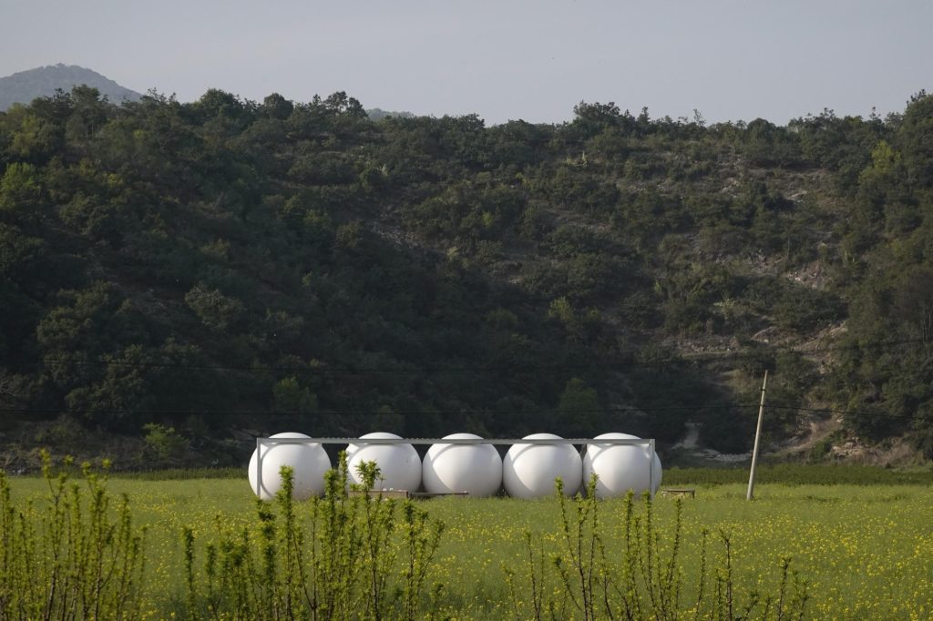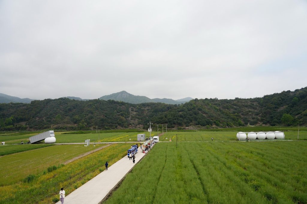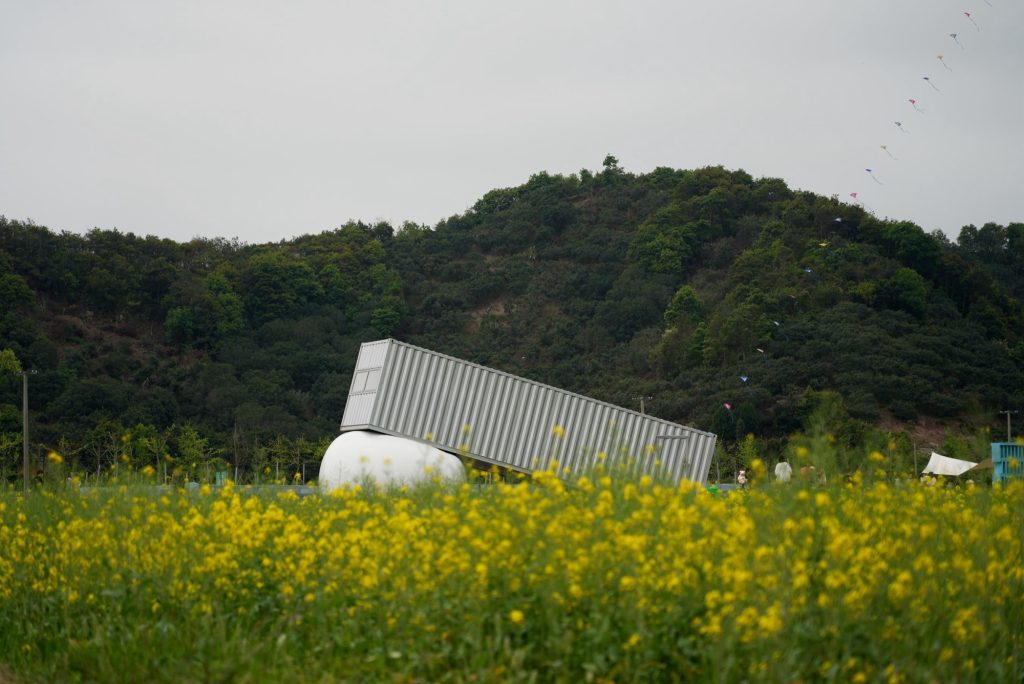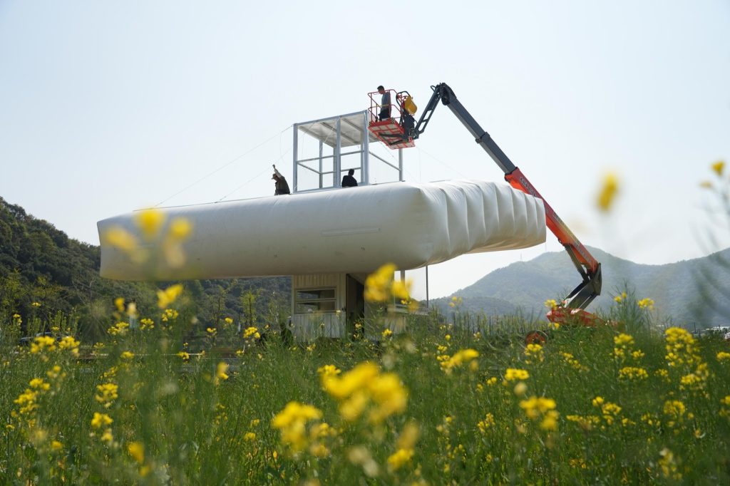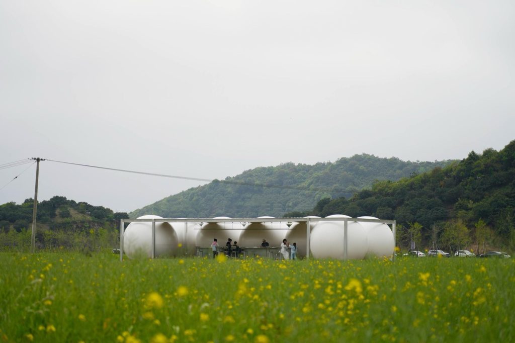 At the entrance to the farmland, an unused utility building had long sat dormant. The site called for a threshold, a moment that signals arrival without overpowering the landscape. The studio’s answer is a cloud: an oversized inflatable canopy hovering above a compact container tower.