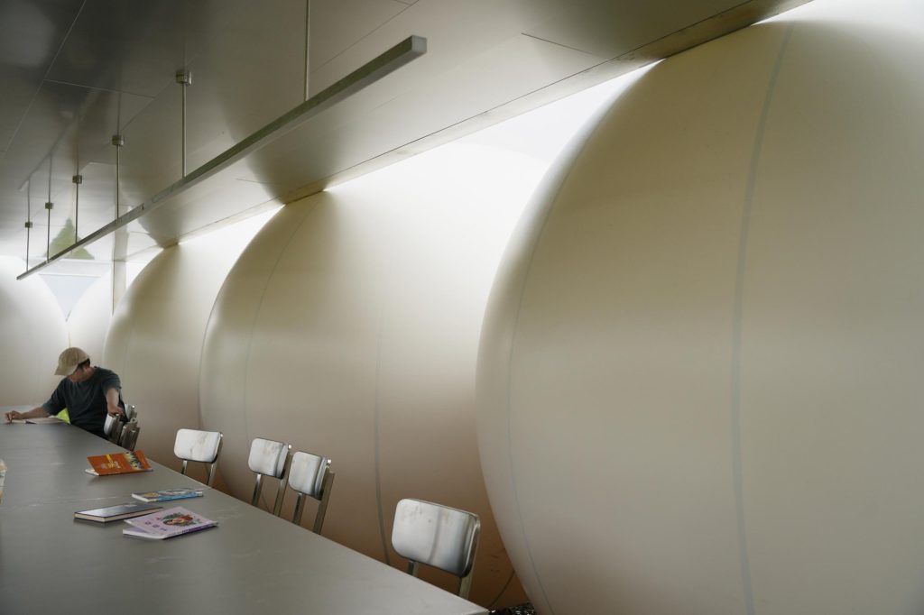 The room is semi outdoor, and its material palette sharpens the tension between cool and soft. An aluminium panel ceiling, stainless steel desks, and gridded floor panels create a metallic discipline. Against this, the inflatables read as smooth, white, rounded volumes that feel almost like weather instruments. Heat changes their expression. In hot conditions the spheres become plumper and tauter. Light changes the room again. Sun filtered from the south slips beneath the roof and catches the semi reflective ceiling, producing a shifting shadow effect that turns reading into a slow negotiation with brightness, air, and time.
