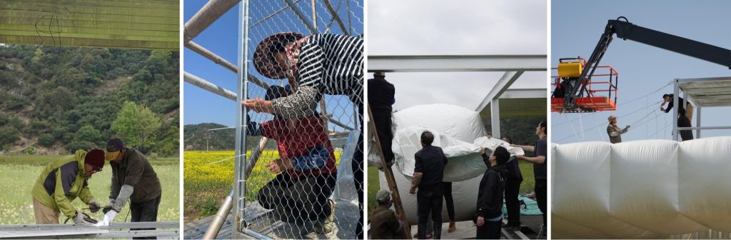 Seven spherical inflatables are placed within a steel frame elevated above the rice fields. Together they form a circular “wall” without a conventional door. Visitors enter by parting the spheres with their bodies, and many only realise the objects are not solid when they touch them and feel the bounce. This moment of discovery is central to the design. It is an architectural threshold made of touch, something conventional building materials rarely provide.
