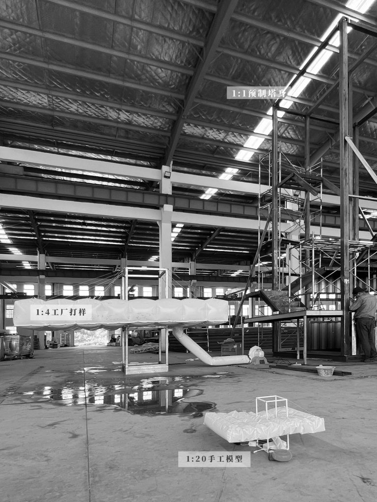 Prototyping progressed from a small hand model to a large factory mock up, then to full scale construction. The process tested not only whether a cloud could be inflated at that scale, but also how the project could be assembled on site within procurement led constraints, where sequence and coordination often matter as much as form.