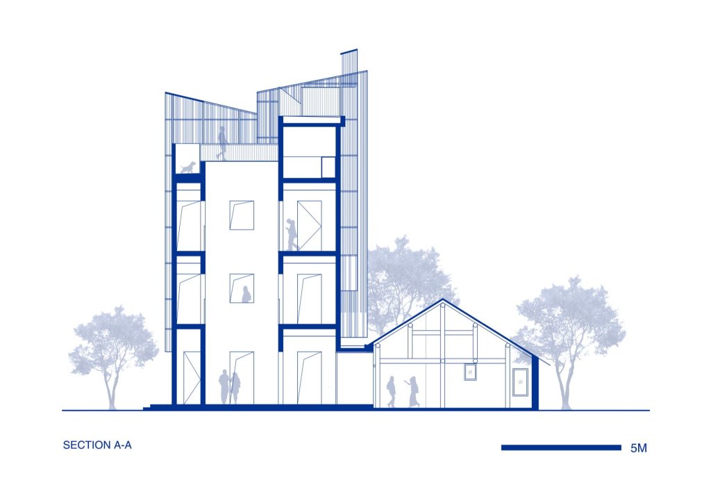 The architects approached the building as something to be re edited rather than erased. The original mass has been deconstructed into four vertical volumes, stitched together by internal courtyards and wrapped by a sequence of staggered rooftop terraces. Read together, the composition works like a quartet: separate forms set in rhythm, producing voids, overlaps, and pauses that temper the building’s scale and introduce a new kind of spatial cadence into the village.