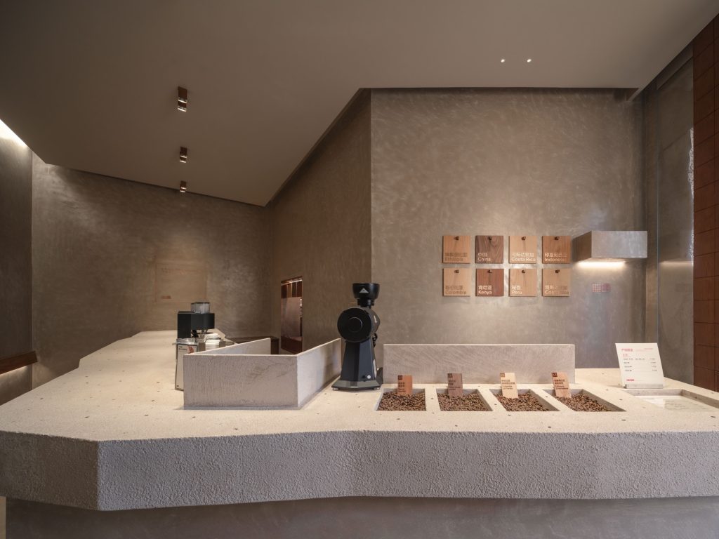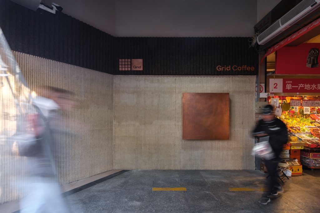 Because the café inherits a stand-and-sip rhythm and a communal, all-you-can-eat coffee culture, atmosphere becomes the primary material. The entrance façade appears deliberately unprogrammed, with a seemingly random composition that leans into naturalistic and artistic cues. A concrete form acts as a framing device, turning the act of drinking coffee into a visible street-level scene and pulling attention toward the threshold.