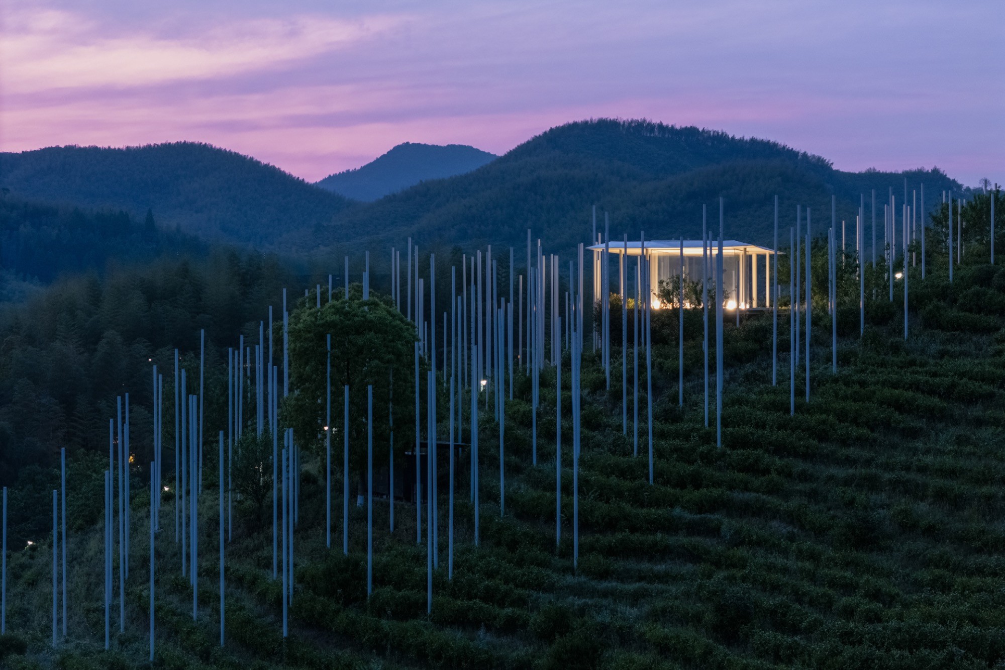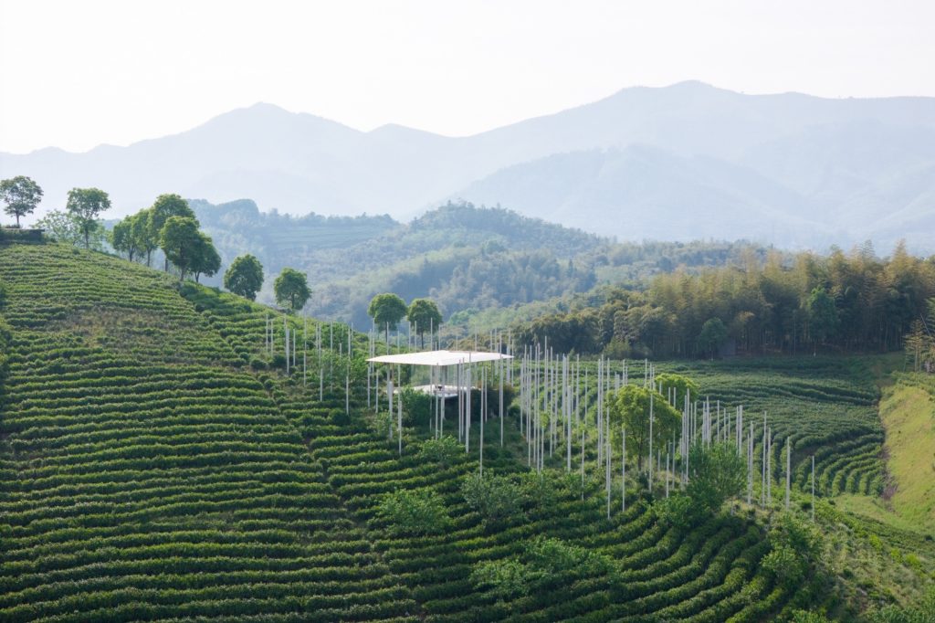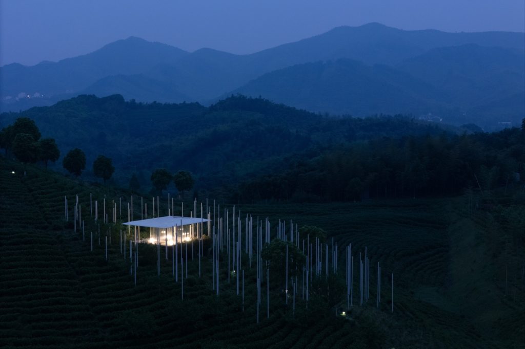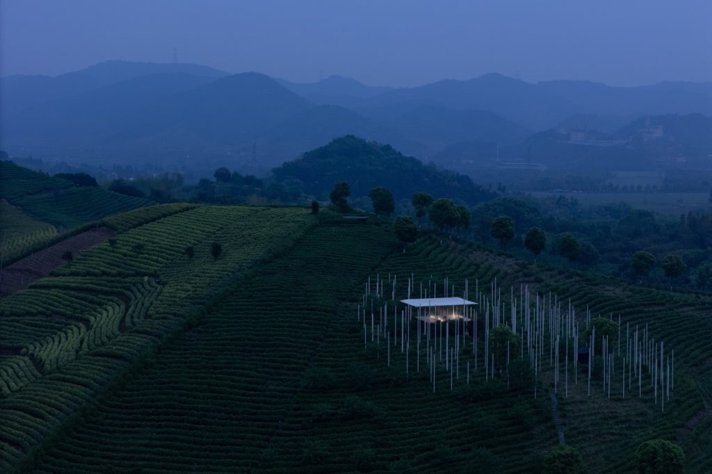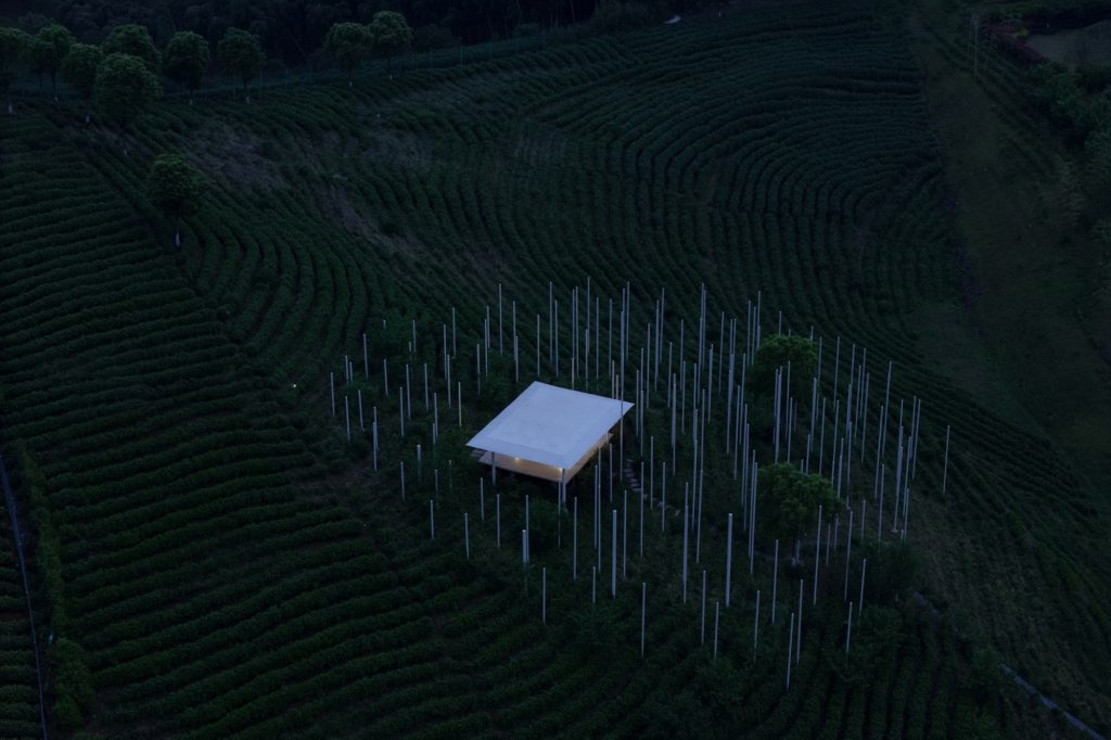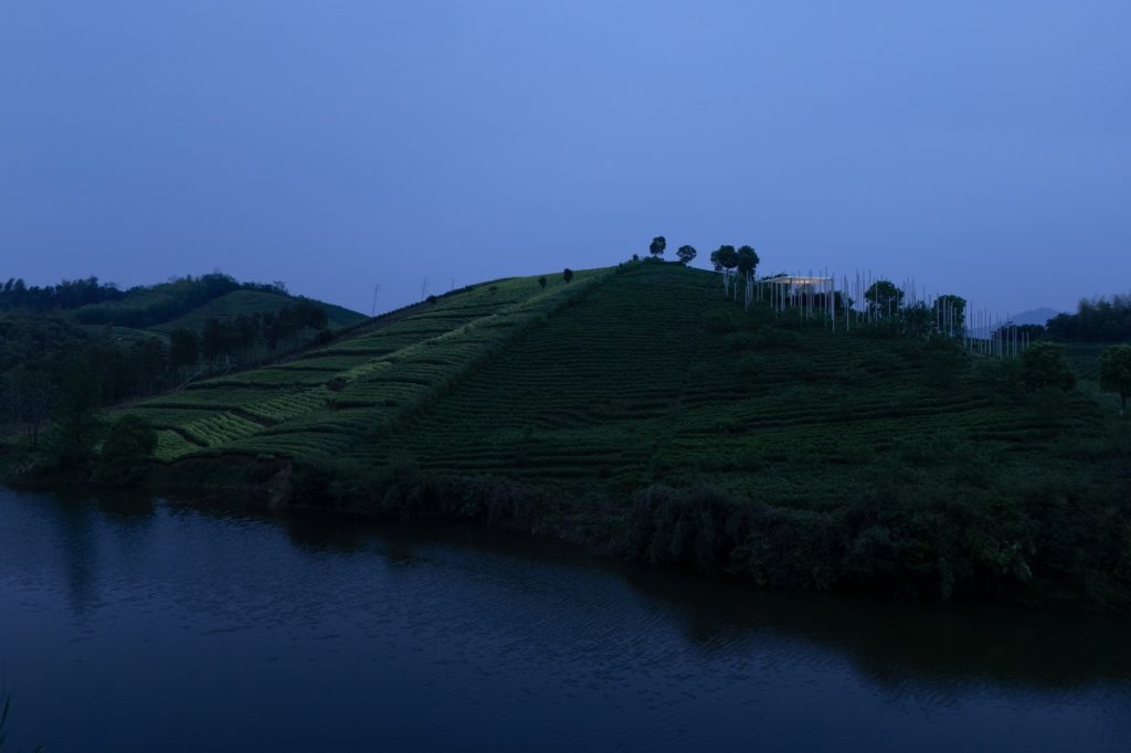 The design begins with a deliberate desire to minimize the physical footprint of the building. Rather than asserting itself against the topography, the teahouse appears as a fleeting presence suspended above the hillside. Slender steel columns lift the structure lightly off the ground, giving the impression that it hovers within the landscape. Transparent glass walls heighten this sensation by visually erasing enclosure, allowing the surrounding tea fields, sky and shifting atmosphere to form the true boundaries of the space.