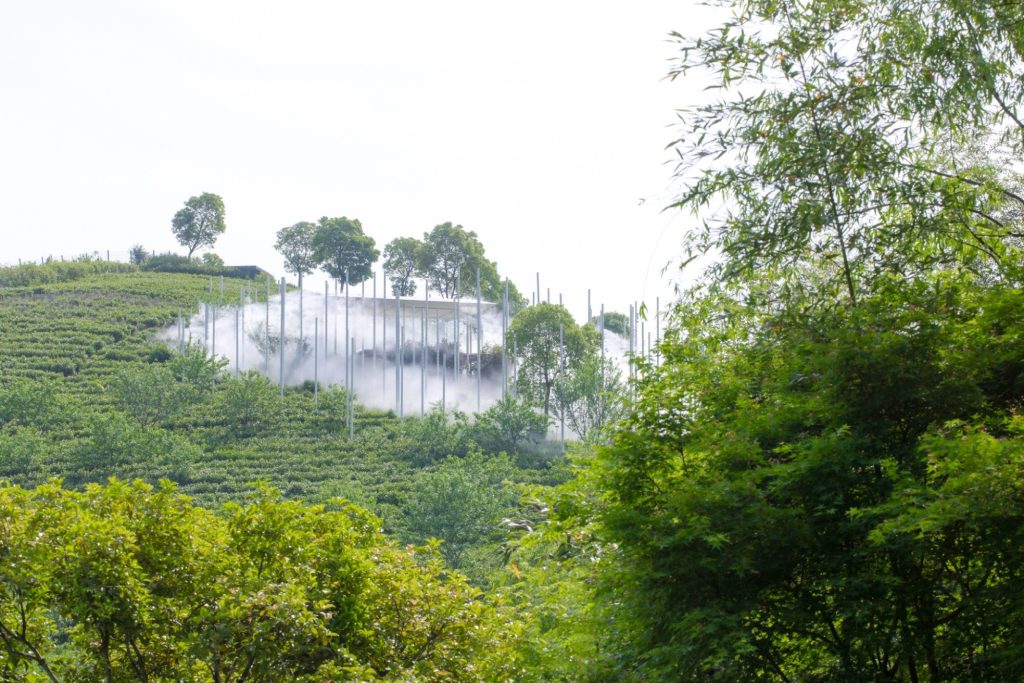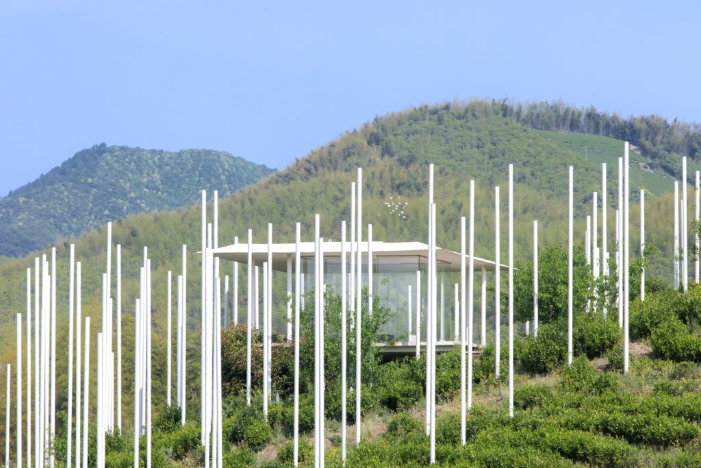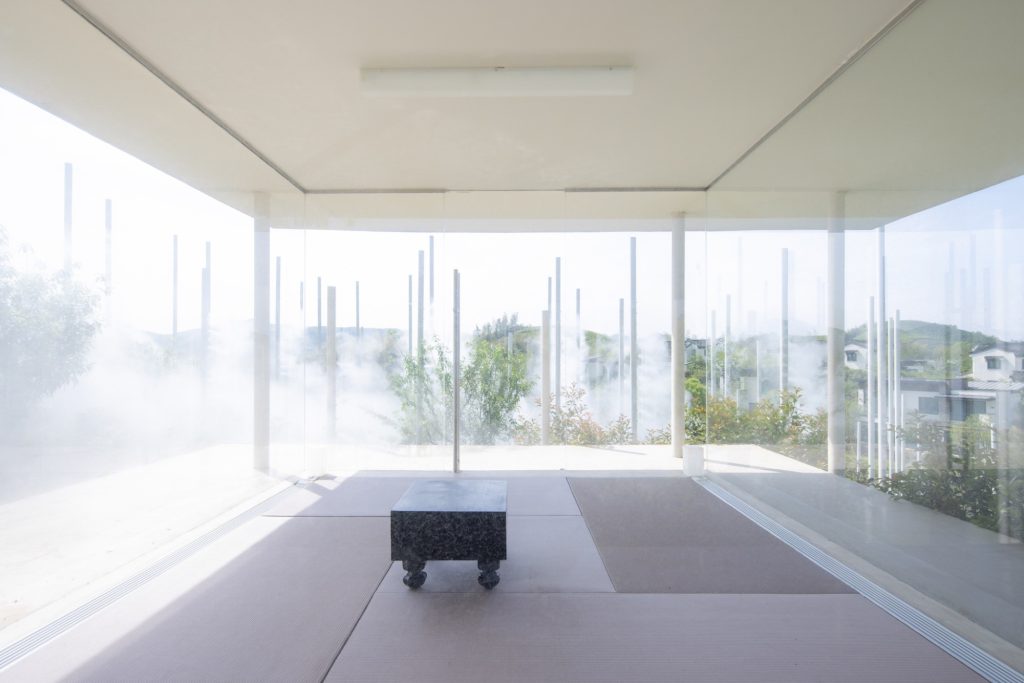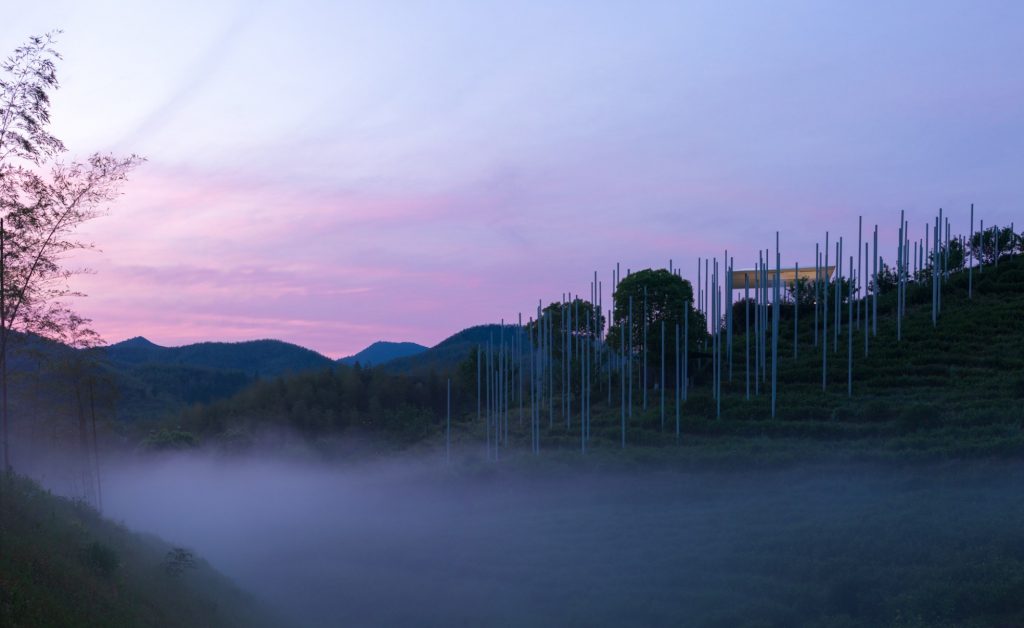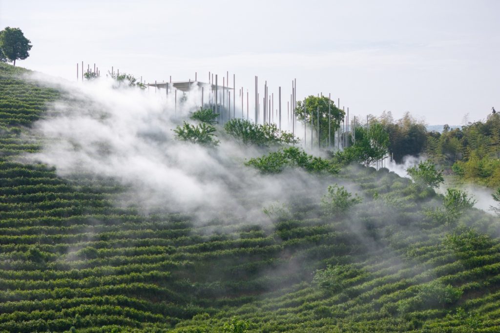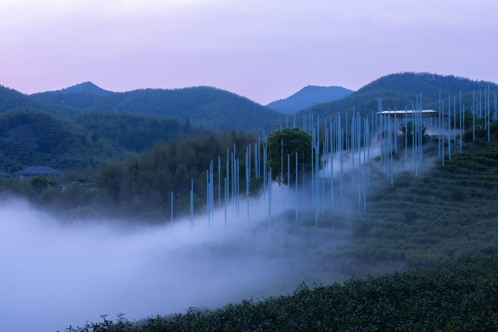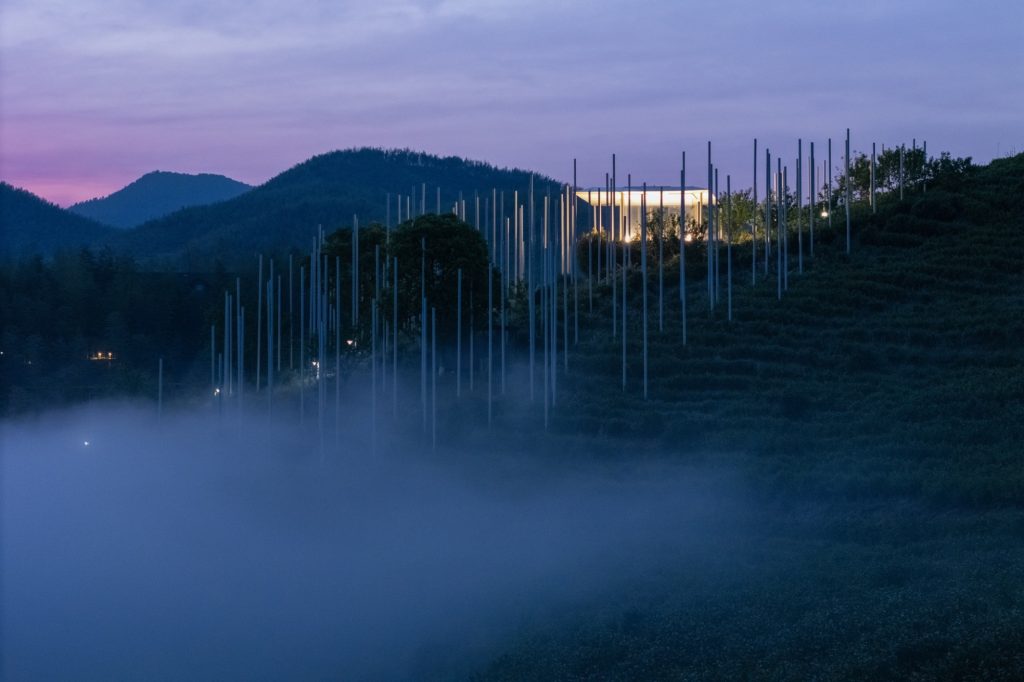 The teahouse is complemented by The Present World, a fog installation composed of 170 steel poles distributed across the slope. These poles act as a three-dimensional drawing, outlining the form of a cloud while supporting a spray and mist system that drifts, gathers and disperses with the wind. The installation becomes a choreography of appearance and disappearance, a poetic expression of time, movement and the cycles of nature.