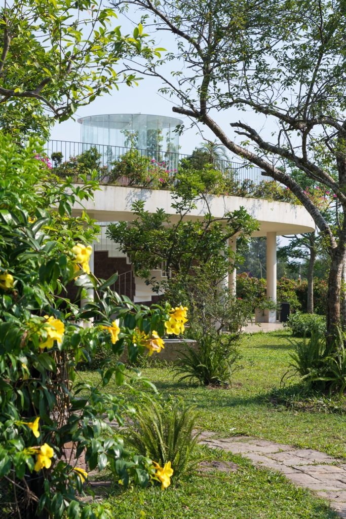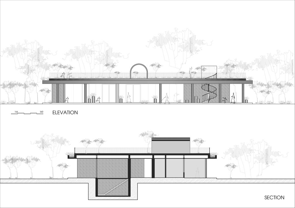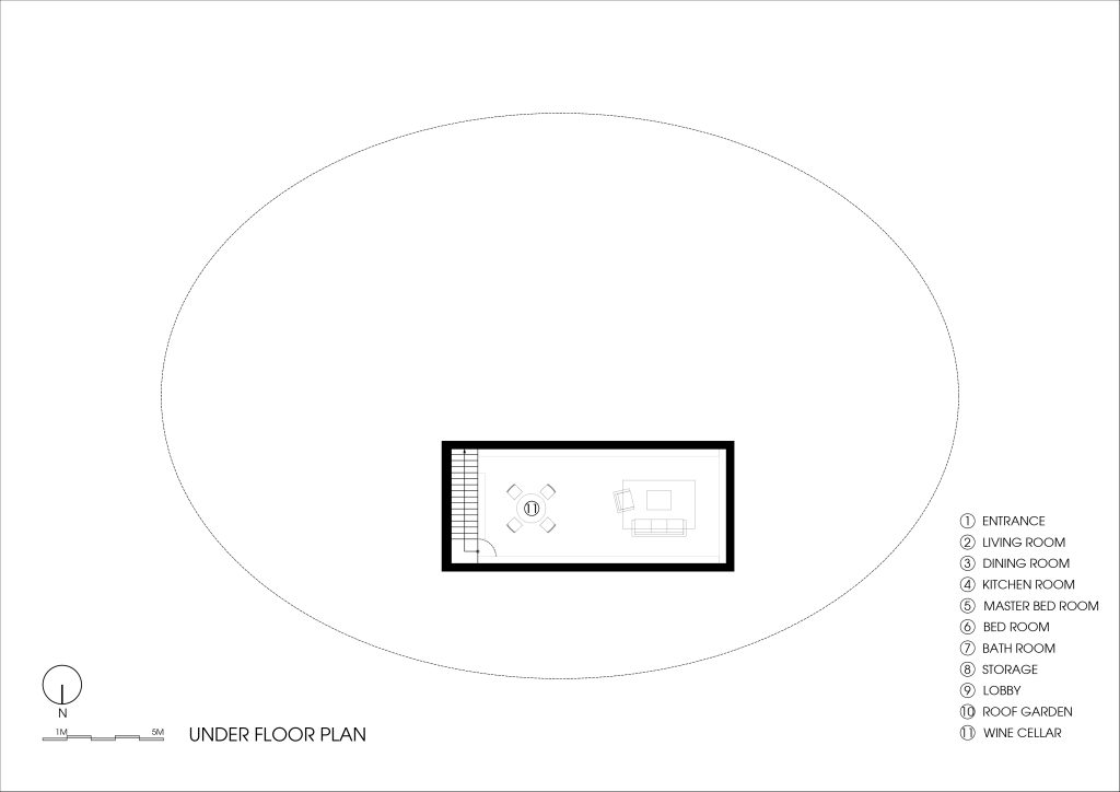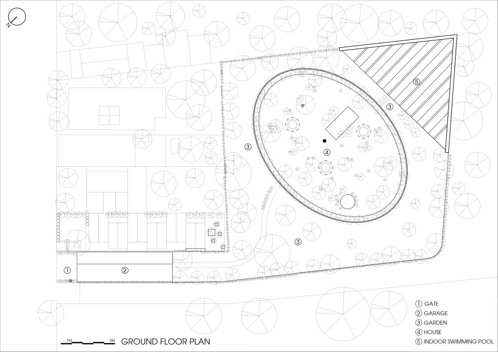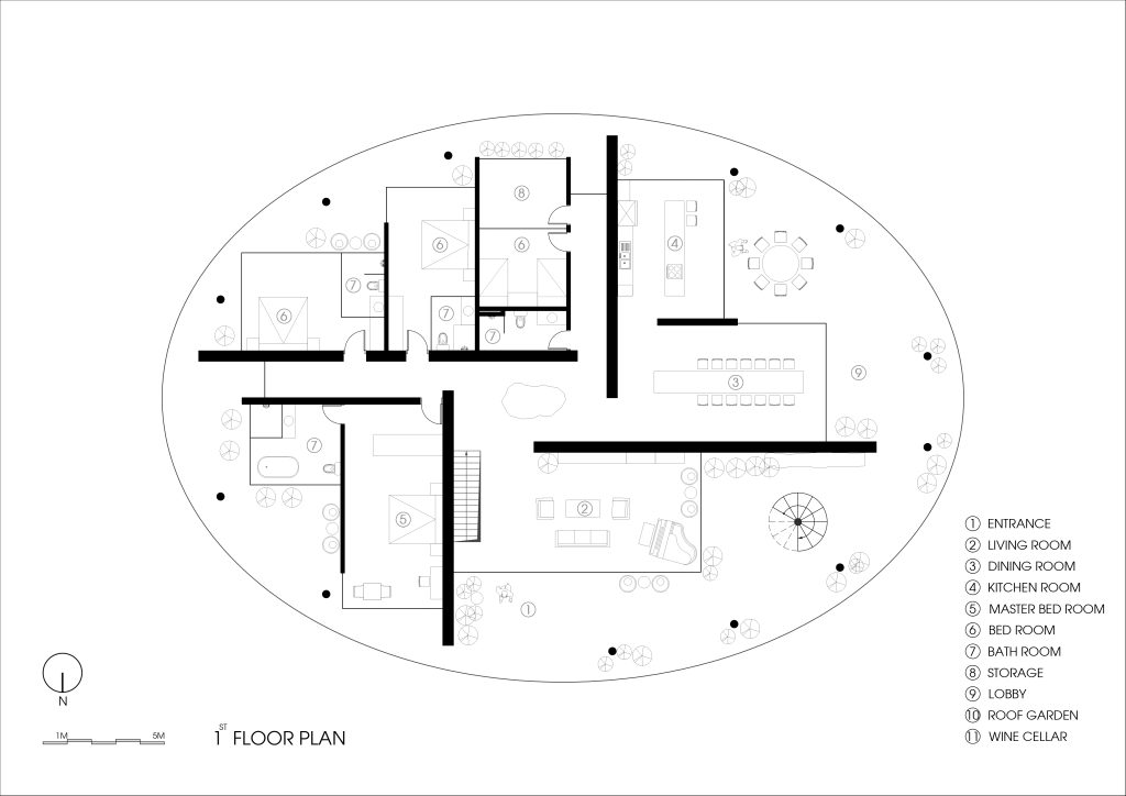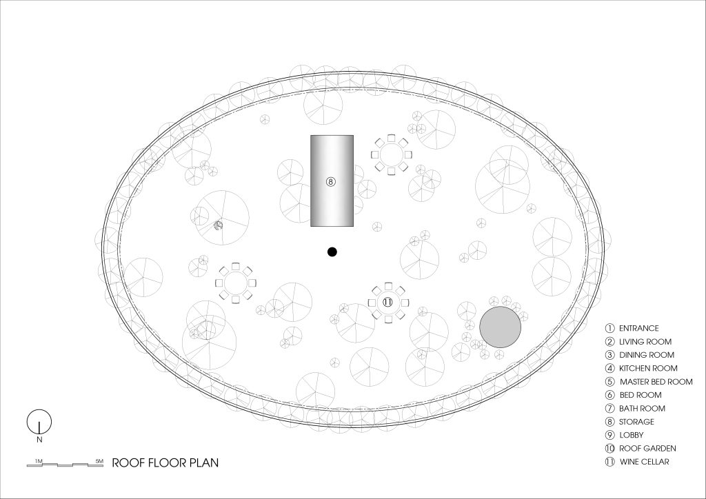 The roof of the elliptical building becomes a rooftop garden for stargazing, gatherings and outdoor activities. Two secondary volumes, a front garage and a rear pool pavilion, frame the site and provide functional separation without disturbing the tranquility of the main living spaces.