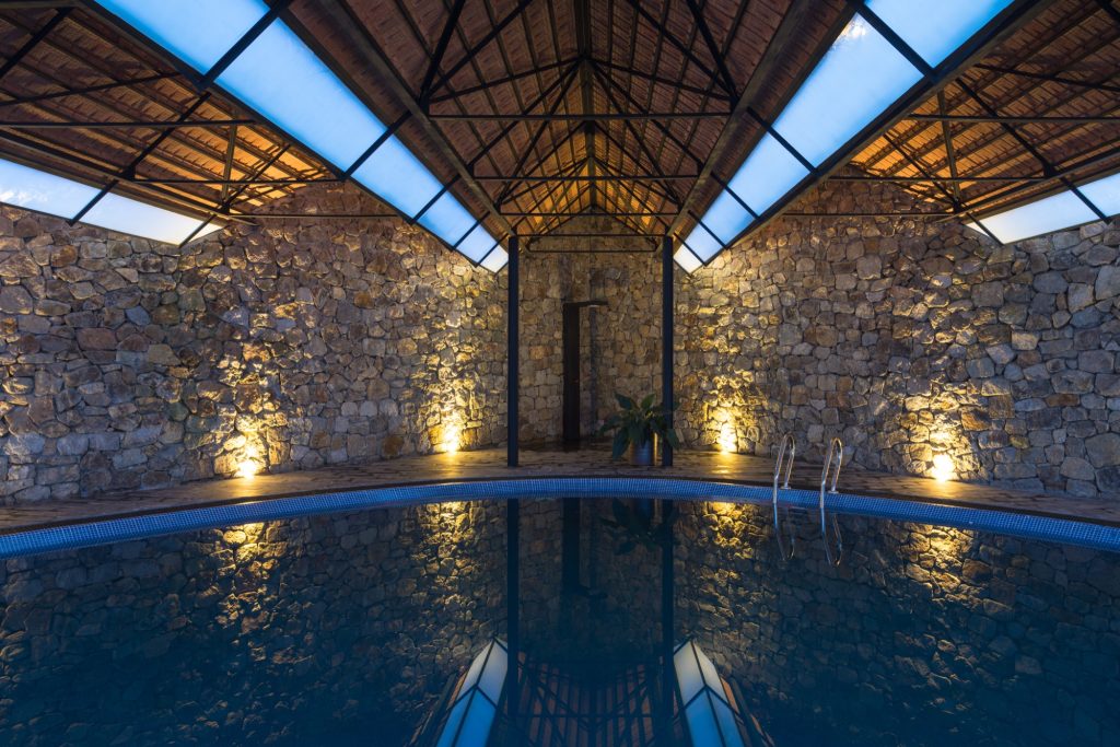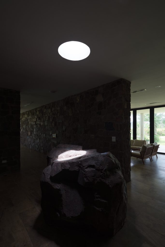 At the center of the project is an elliptical main volume that appears as a “vault of heaven” lifted above the landscape. Supported by four stone walls aligned with the cardinal directions, the structure creates a flowing interior layout that blends public and private spaces. Deep eaves wrap around the perimeter, softening the transition between indoor areas and the surrounding gardens. A symbolic stone marks the heart of the house, emphasizing family unity.