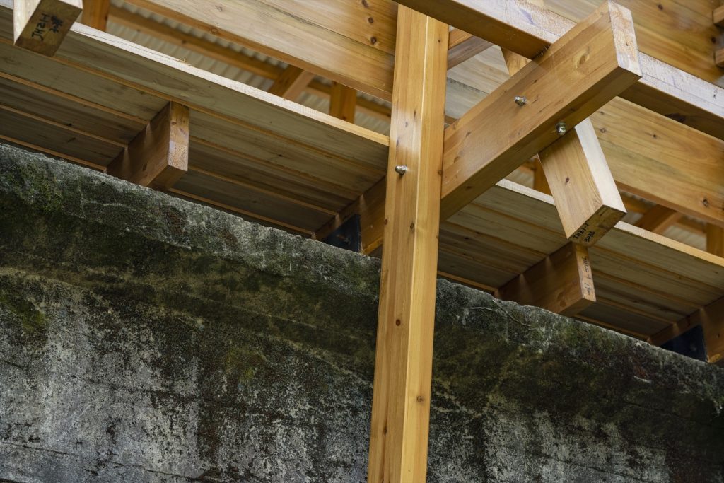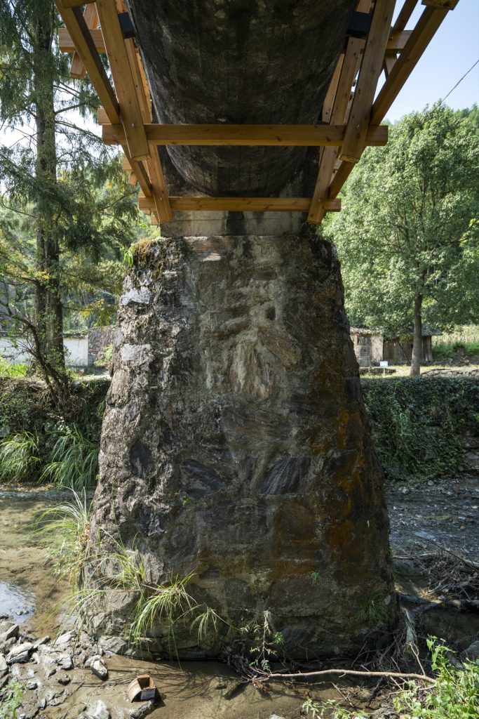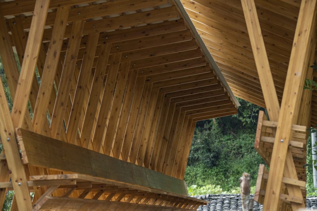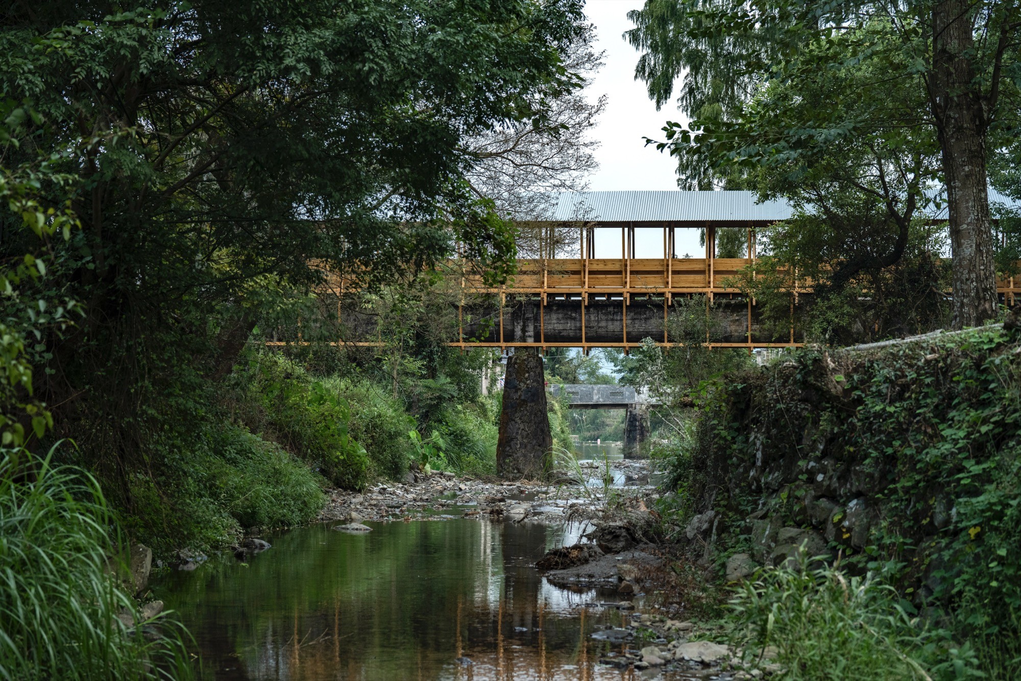Rather than replacing the aqueduct, the design preserves its rough surfaces, moss, and vegetation, treating patina as heritage. A lightweight wooden structure is placed over the concrete like a second skin, echoing Huizhou architectural sensibilities while minimising additional load.
