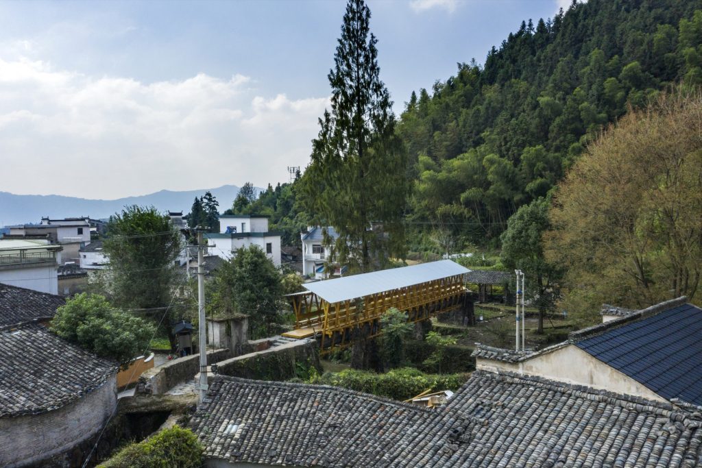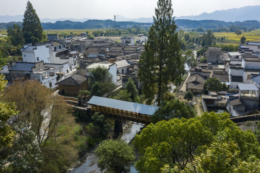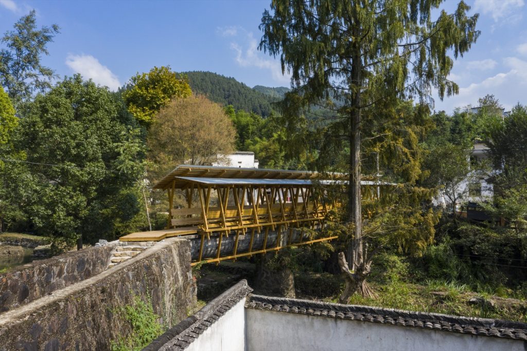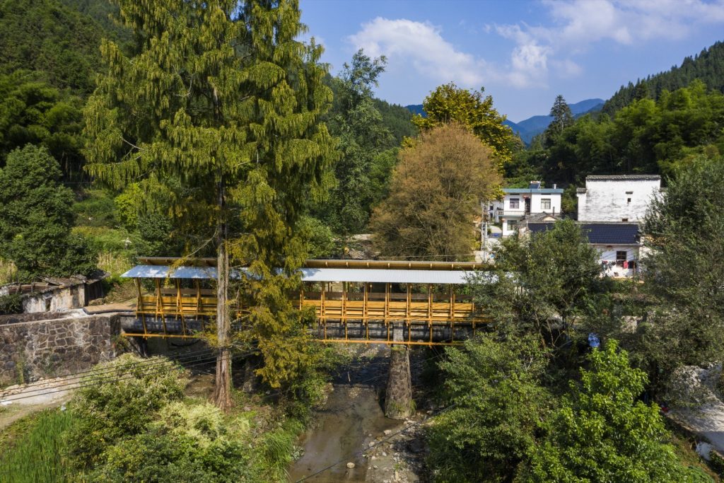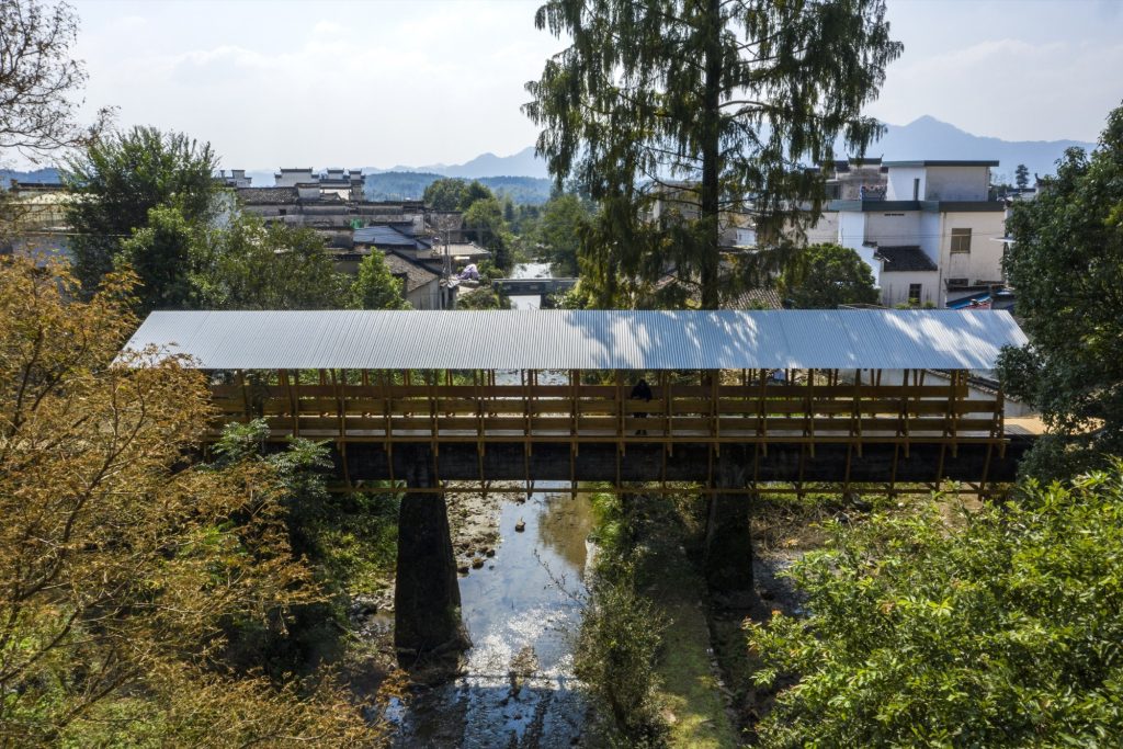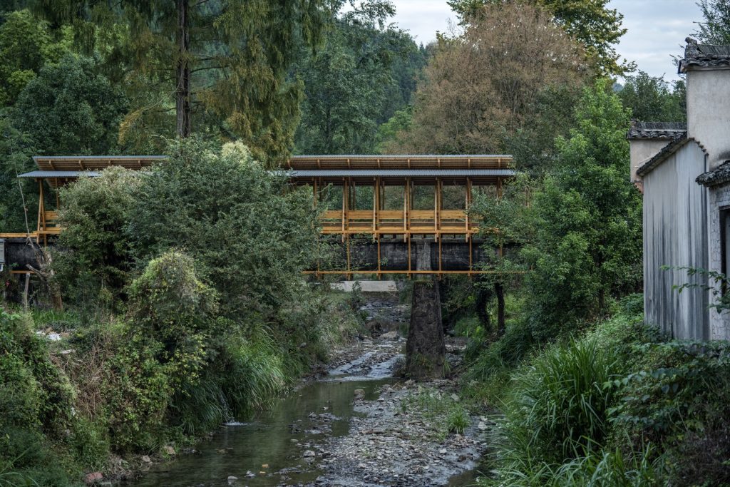 A prefabricated CLT covered bridge overlays a 1960s aqueduct in Fengwu Village, Huangshan, transforming disused irrigation infrastructure into a shaded public space.