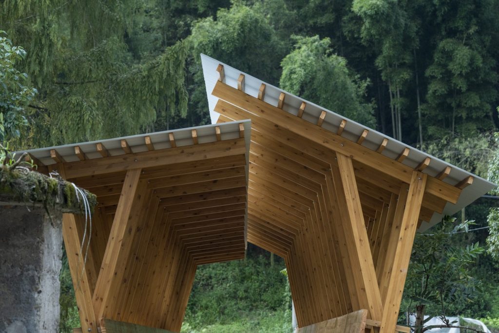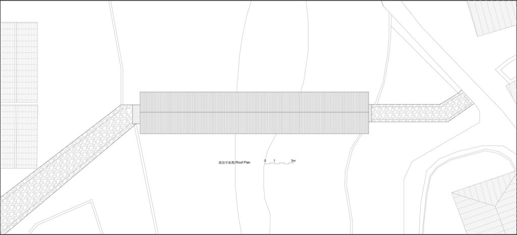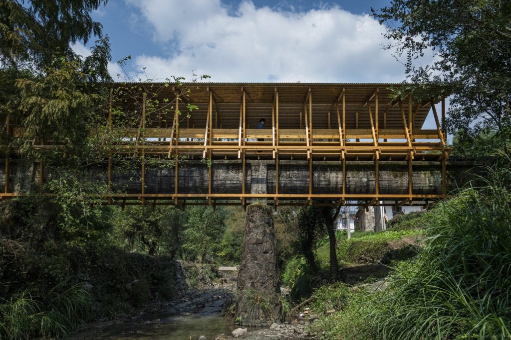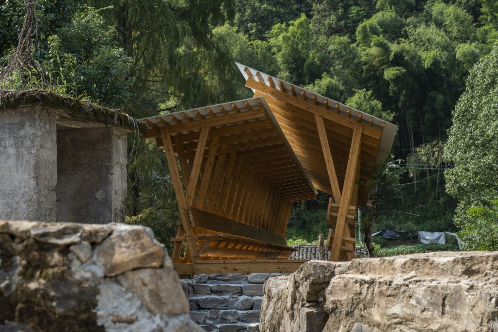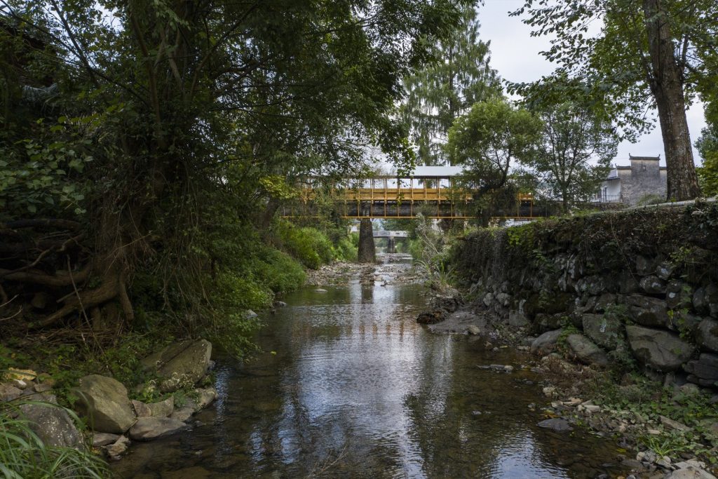 One key intervention, The Covered Bridge on Aqueduct, reclaims an abandoned 1960s irrigation channel: a U-shaped concrete aqueduct spanning the Fengxi River. Long embedded in villagers’ memories of farming and childhood play, it sits beside a monumental metasequoia, revered as the village’s fengshui tree, forming a powerful, ready-made place.