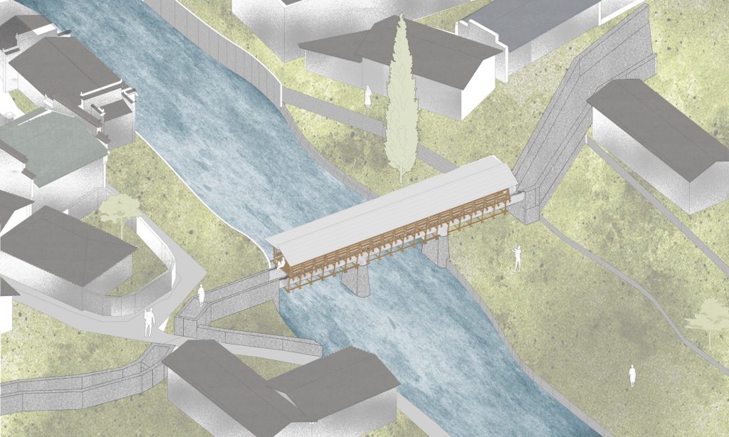 The existing bridge functioned mainly as a passage, offering little comfort or reason to stay. The project transforms it into a shaded public room, a covered bridge designed for rest, conversation, and informal gatherings, strengthening the village’s social life without monumental gestures.