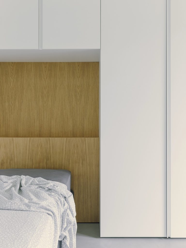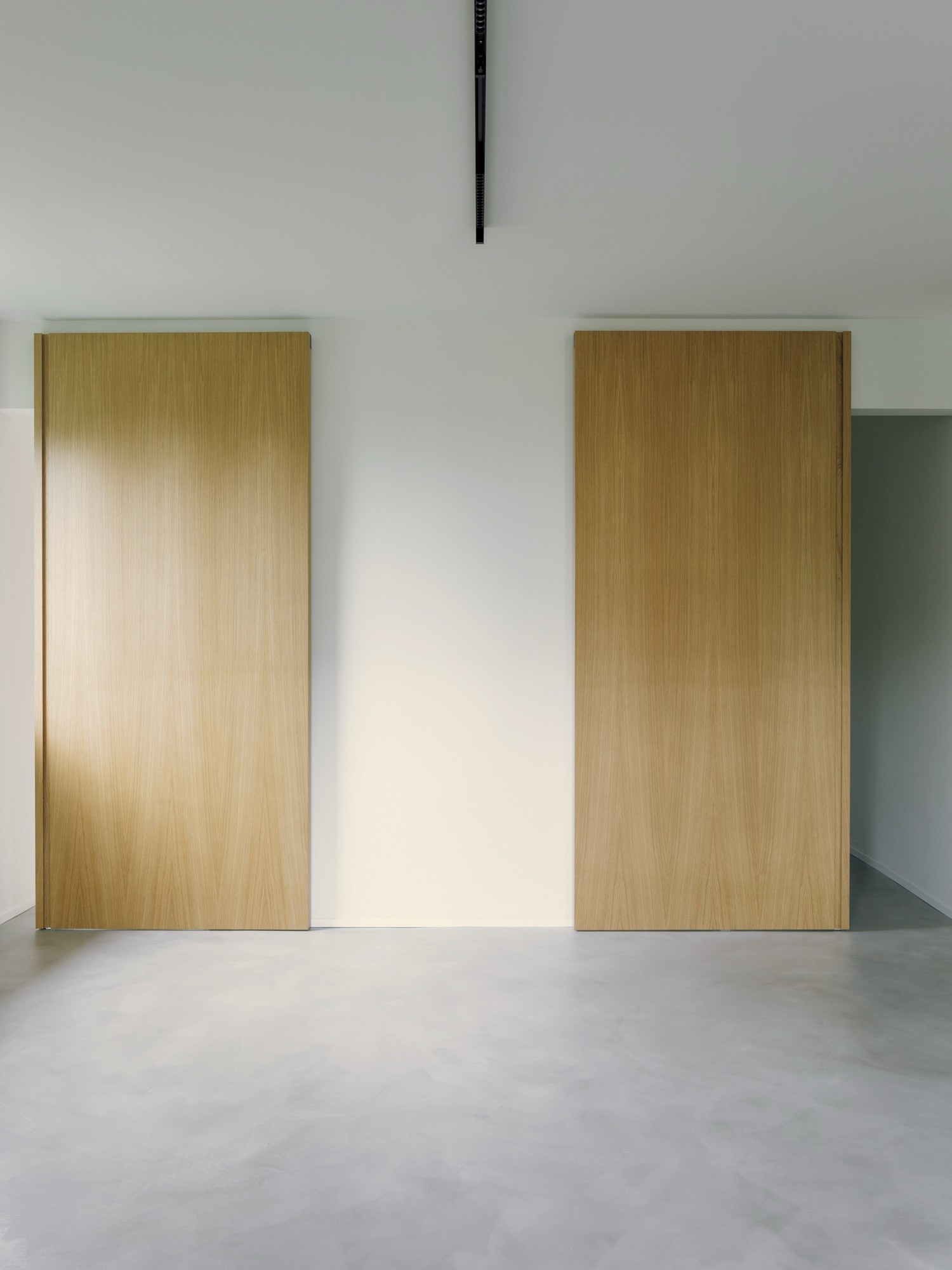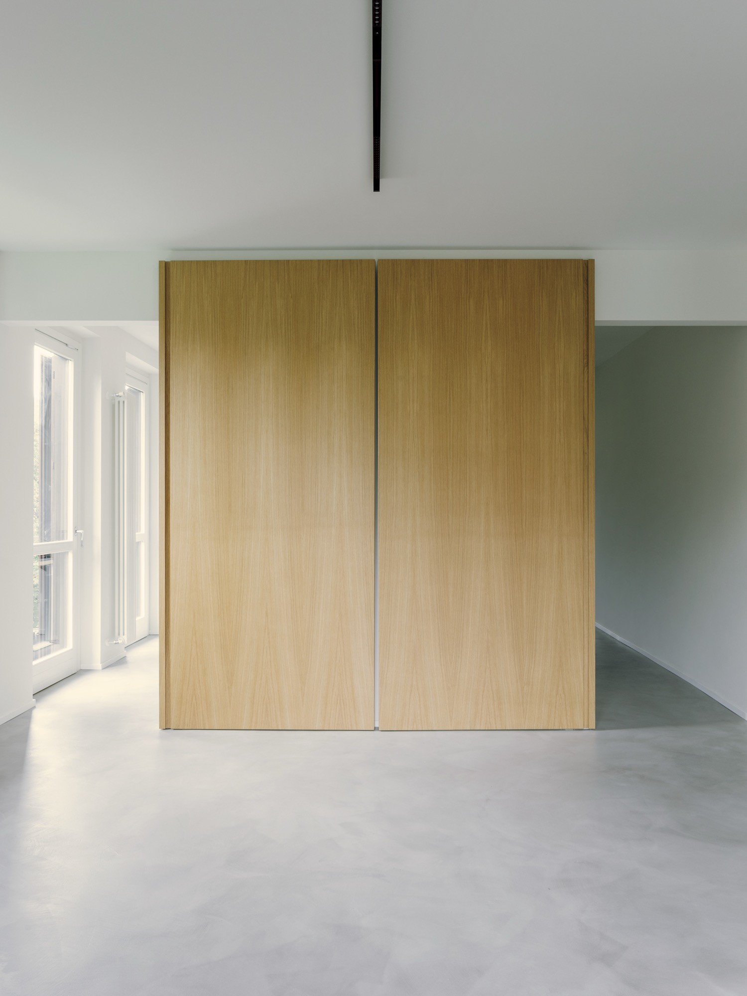 Instead of adding more walls, the project relies on a double sliding wooden panel system in oak to regulate privacy and connection. It can screen the hallway and studio when focus is needed, then open to restore continuity and expand the sense of shared space. A change in flooring at the entrance reinforces the idea of threshold, while a precise cut creates a framed glimpse inward, using controlled views to generate fluidity without resorting to an anonymous open plan.