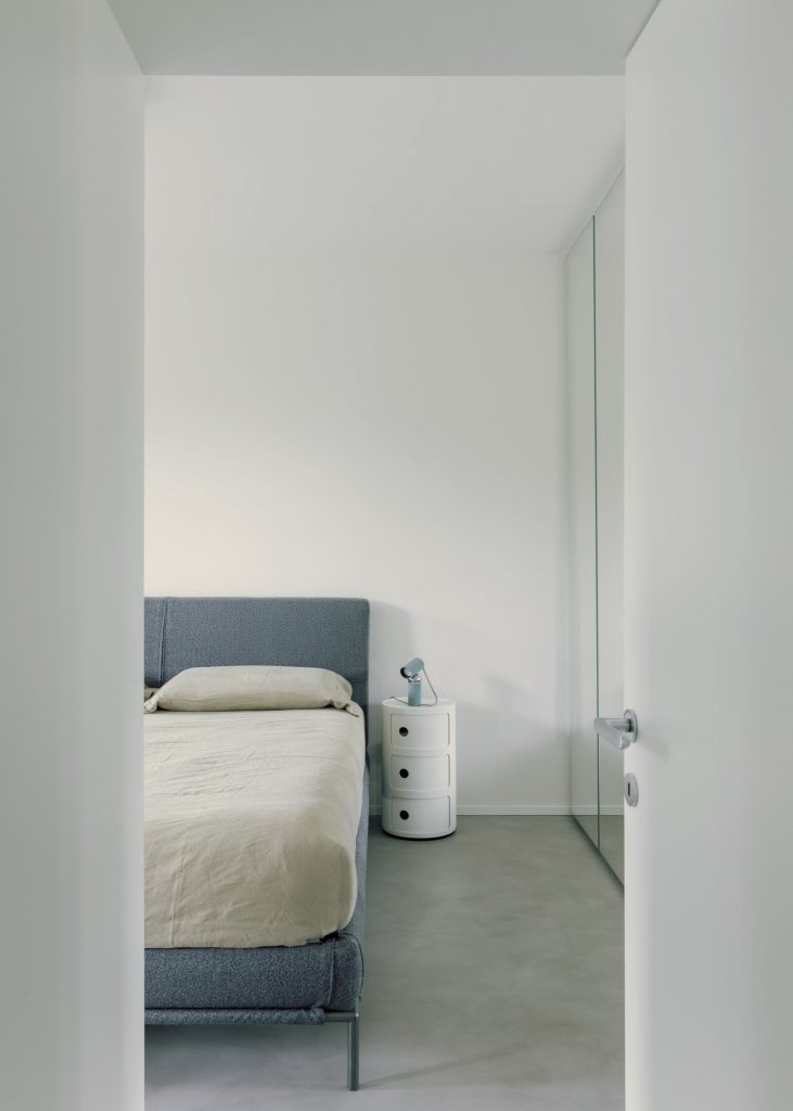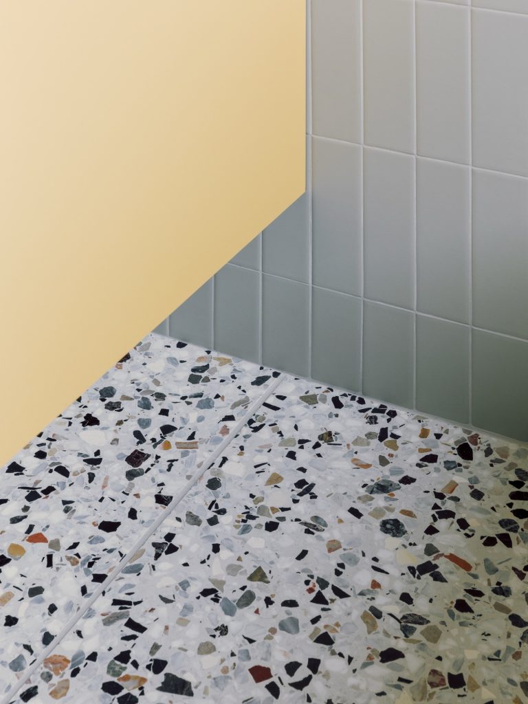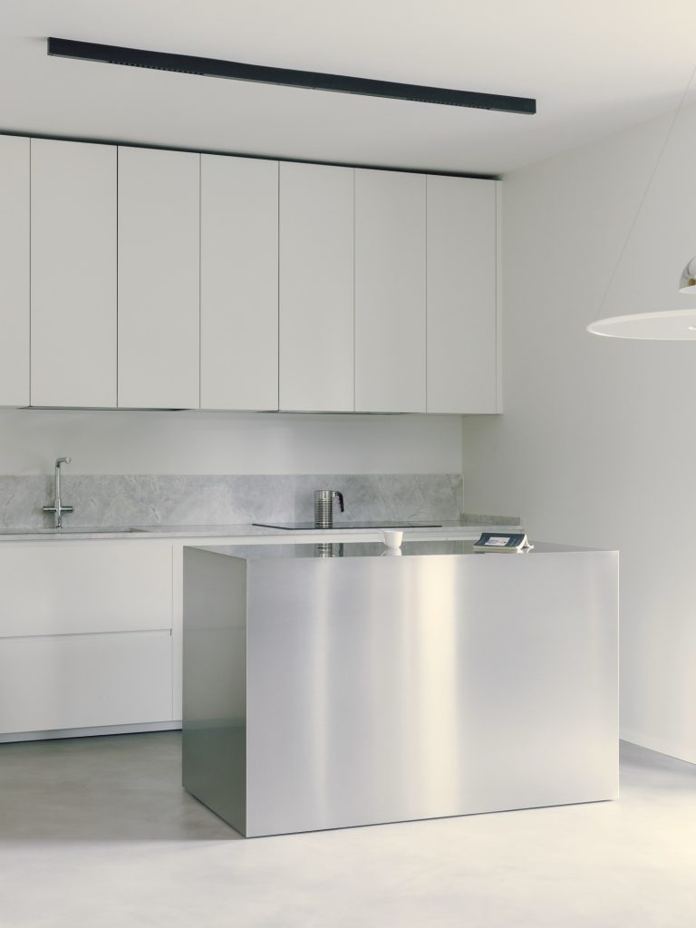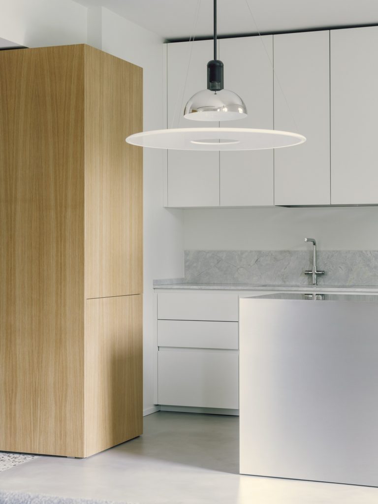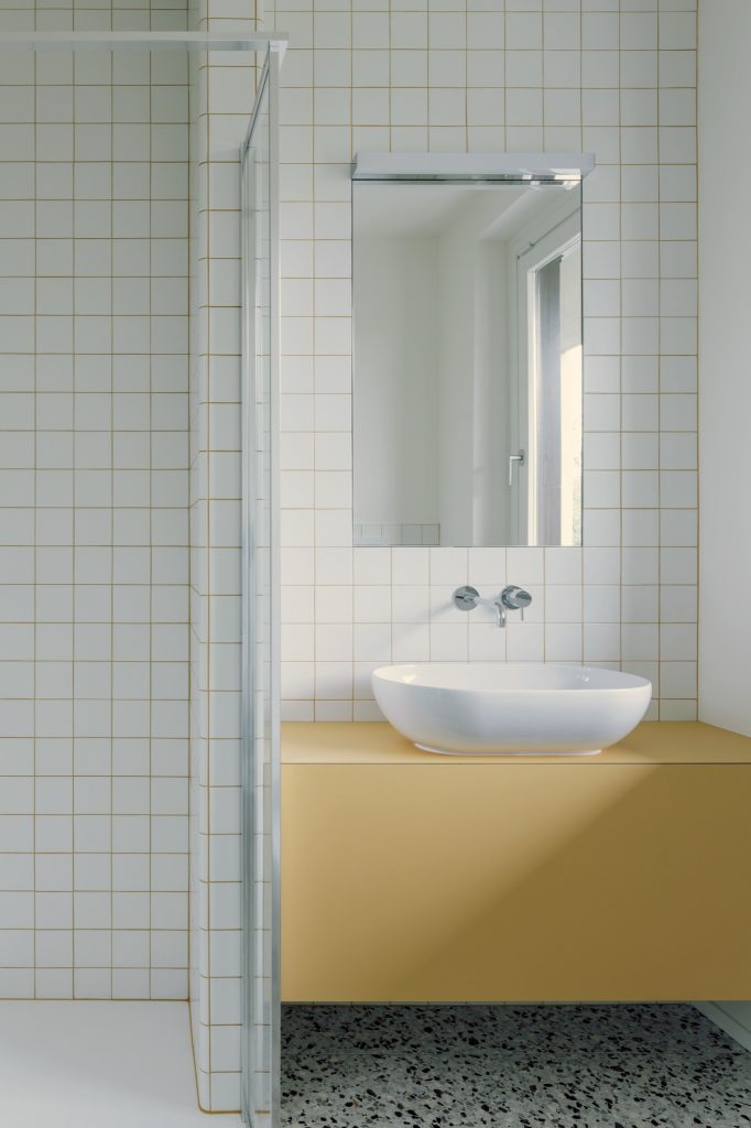 Material continuity tightens the whole interior. Terrazzo flooring links key moments of the home, while bathrooms adopt the same terrazzo and pair it with wall tiles set out in a clean grid, a subtle echo of the owner’s graphic design background. The kitchen is kept sharply linear in white, topped with veined granite, and anchored by a stainless-steel island that brings a professional, social edge.