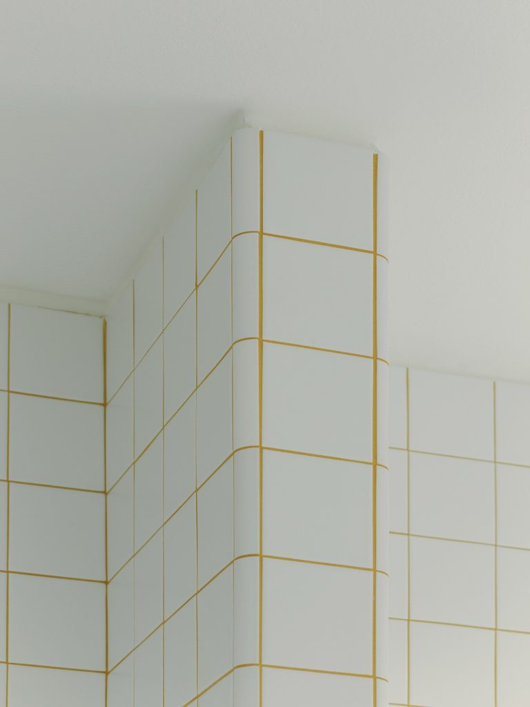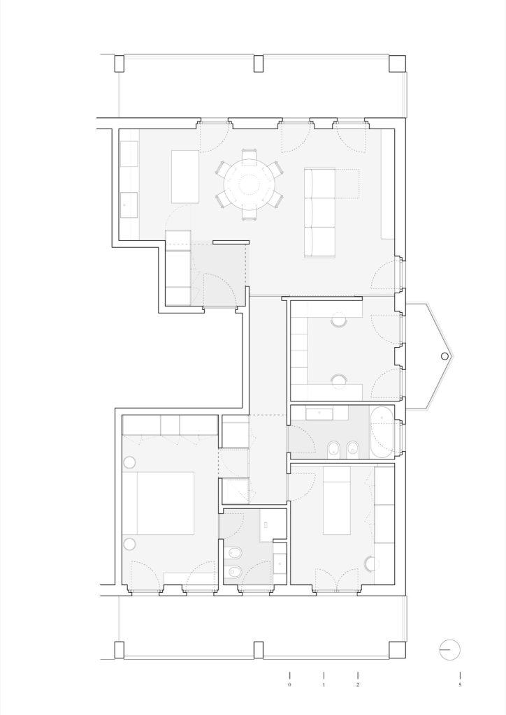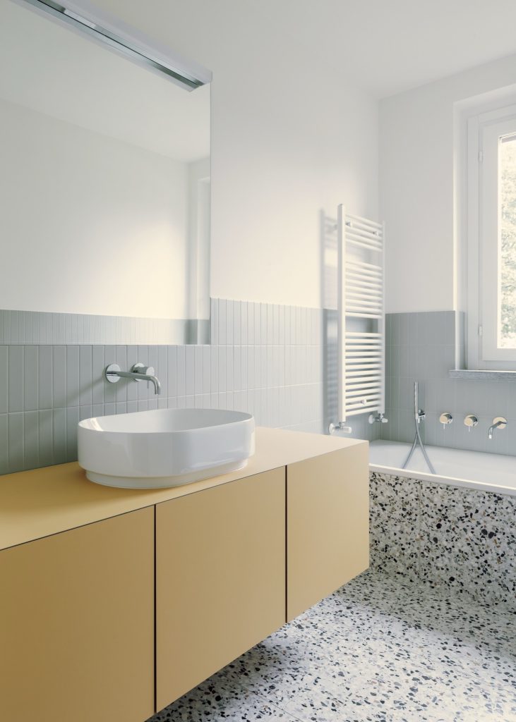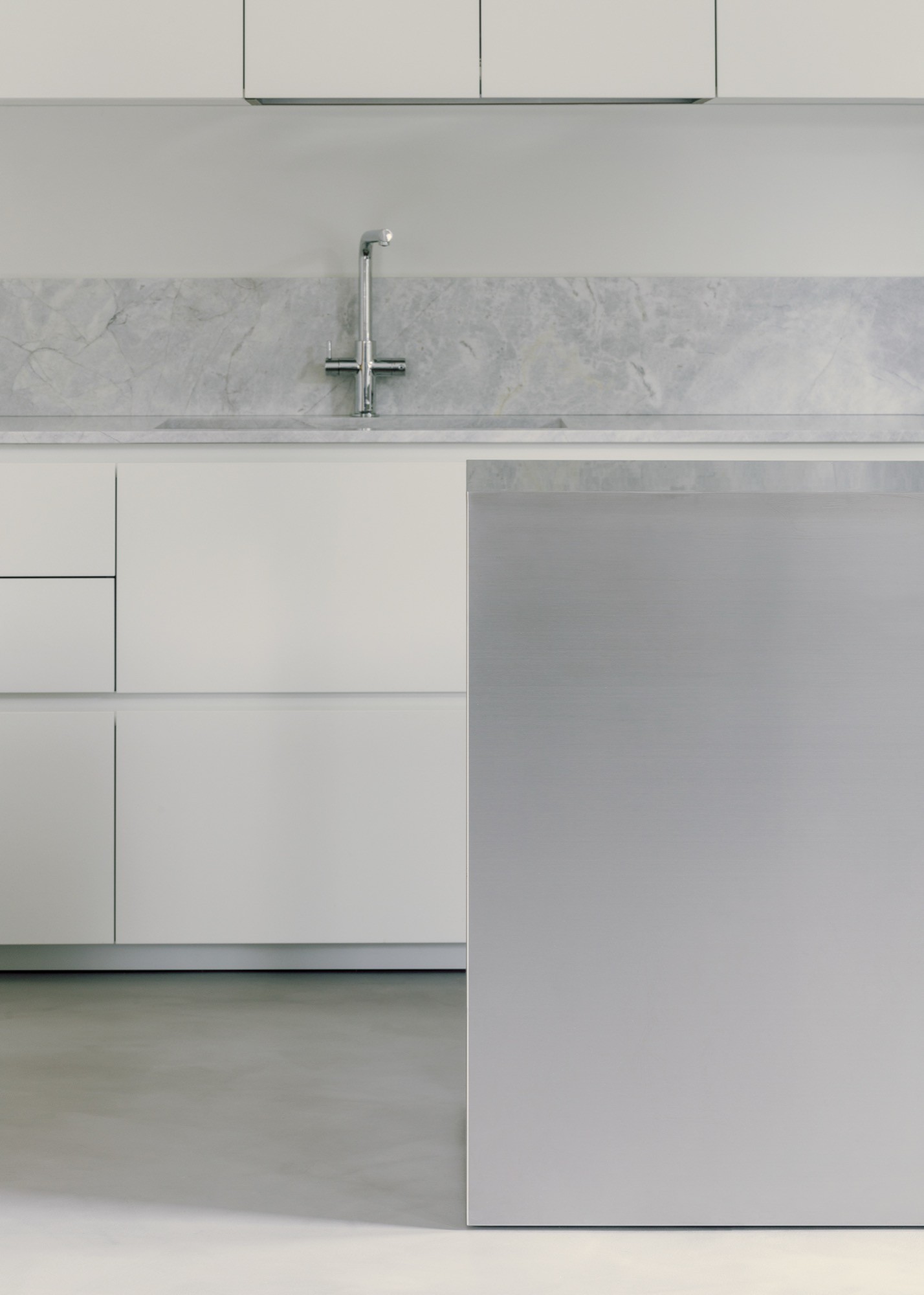 Material continuity tightens the whole interior. Terrazzo flooring links key moments of the home, while bathrooms adopt the same terrazzo and pair it with wall tiles set out in a clean grid, a subtle echo of the owner’s graphic design background. The kitchen is kept sharply linear in white, topped with veined granite, and anchored by a stainless-steel island that brings a professional, social edge.