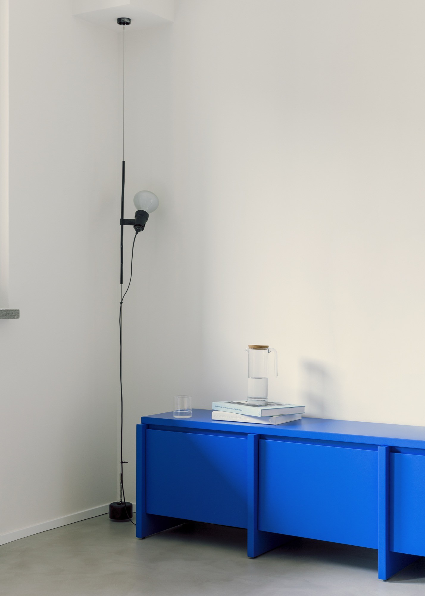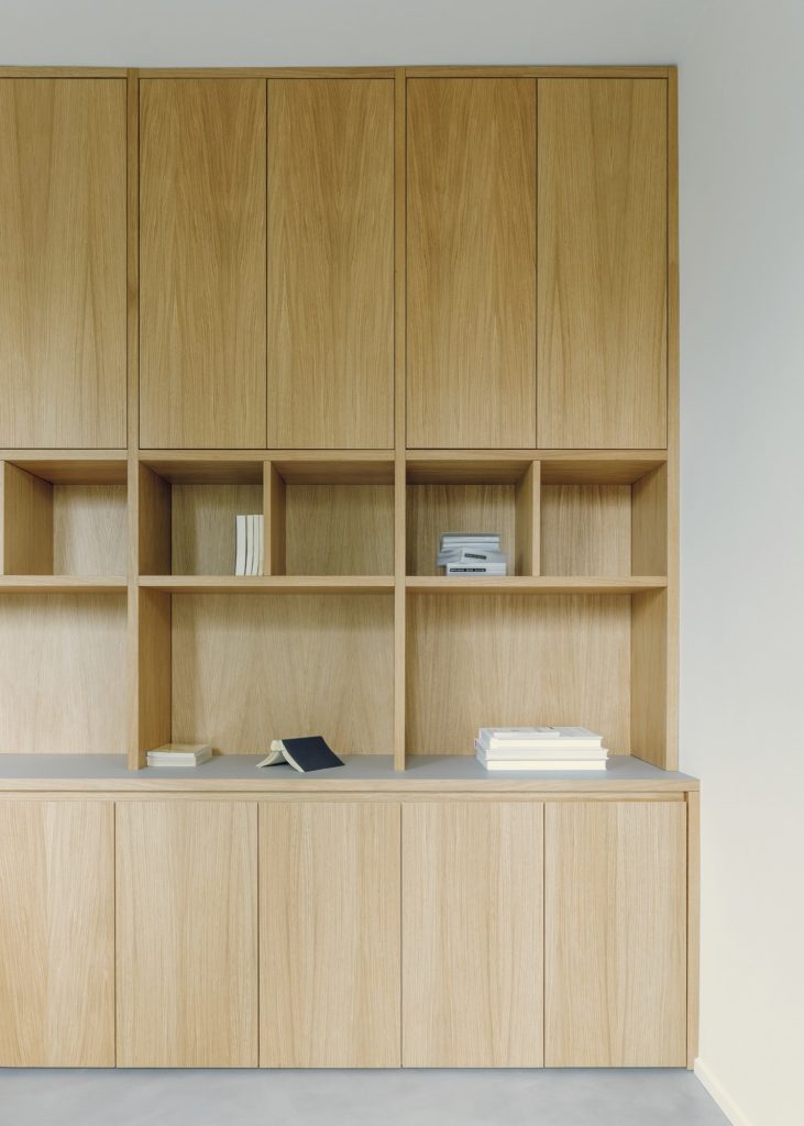 Custom-made furnishings, developed with the other homeowner’s furniture company, carry much of the project’s identity. An oak bookshelf with a Fenix worktop organises the studio, while a bold blue volume punctuates the living area with a controlled burst of playfulness. The result is a calibrated mix of oak, terrazzo, granite, and steel, where interior design reads as a system of adaptable elements rather than a sequence of rooms.