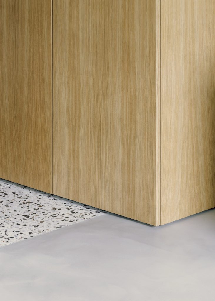 Sliding oak panels, terrazzo continuity, and custom furniture shape an adaptable apartment renovation that supports studio life and a kitchen designed for hosting.