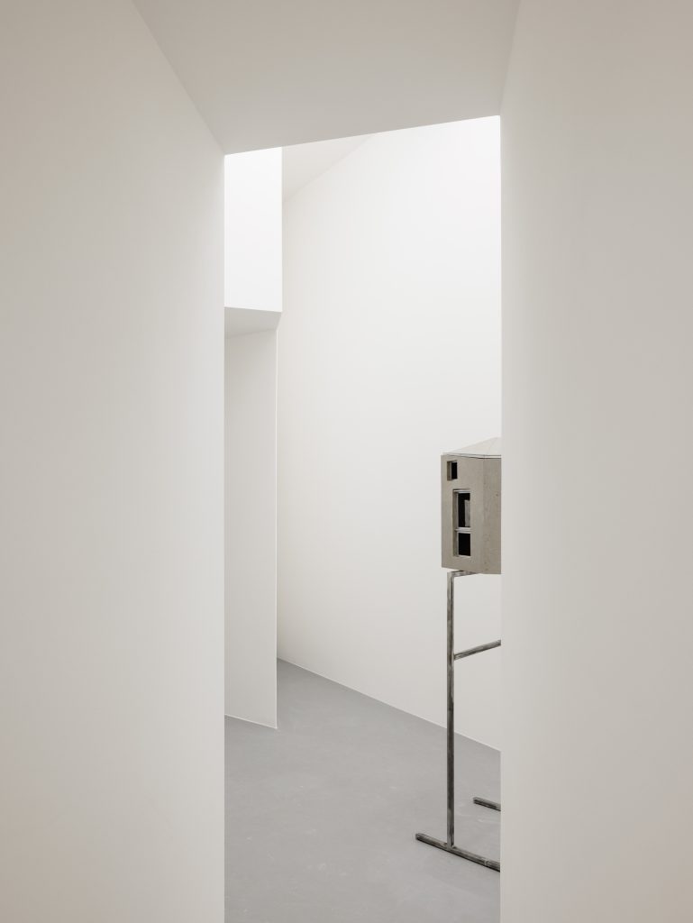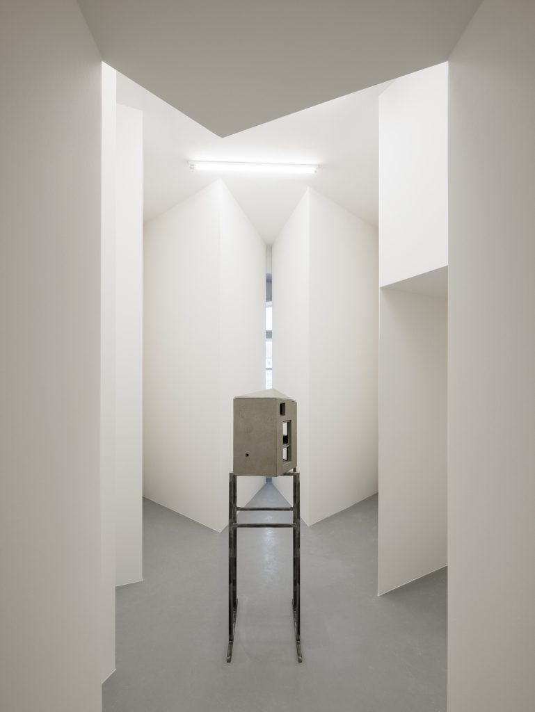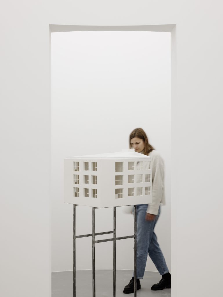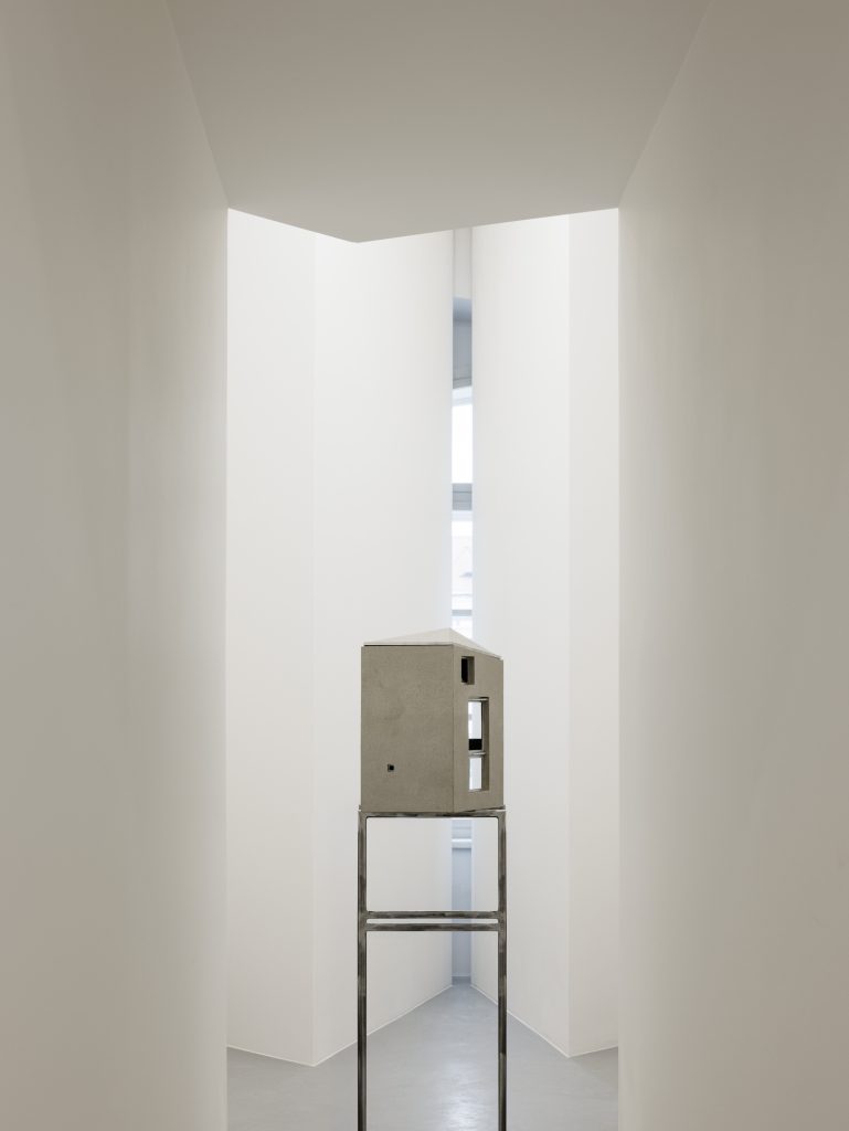 The title A House Within carries a double meaning Symbolically, it refers to the exhibition’s intention to present architecture as a spatial experience. The inserted house transforms the way one moves, sees, and perceives light and detail, offering a space for calm and focus. Through a narrow slit, it is still possible to glimpse the gallery’s original interior.