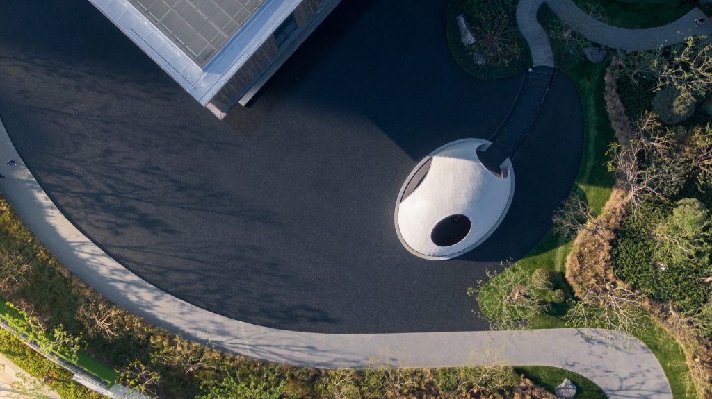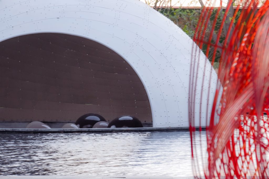 The pavilion’s exterior is finished in white, producing a tranquil reflection on the water below. The interior adopts a matte brown gold tone that softens glare and creates a cave like depth. The centripetal dome forms an intimate chamber that amplifies even small sounds, encouraging meditation and quiet conversation. Together, the surrounding water, the dome, and the filtered light establish a contemplative atmosphere reminiscent of a secluded landscape of mountains and sea.