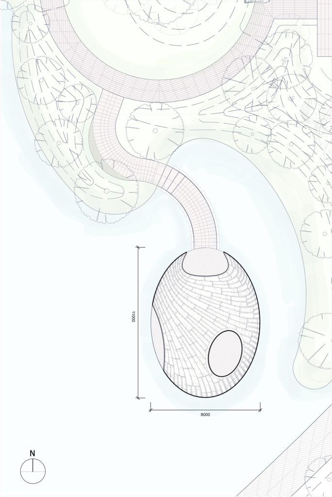The pavilion’s form draws from two natural archetypes studied by the research team. The woven density of a bird’s nest suggested a structural language of segmentation and interlacing. The load distribution of an eggshell offered a model for how curved surfaces can transmit forces efficiently with minimal material. These references informed a centripetal dome and a seamless shell that serves simultaneously as enclosure and structure.