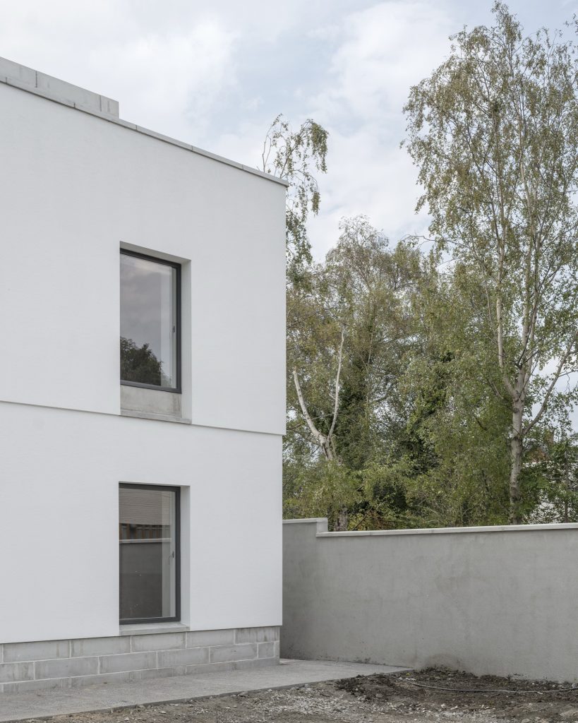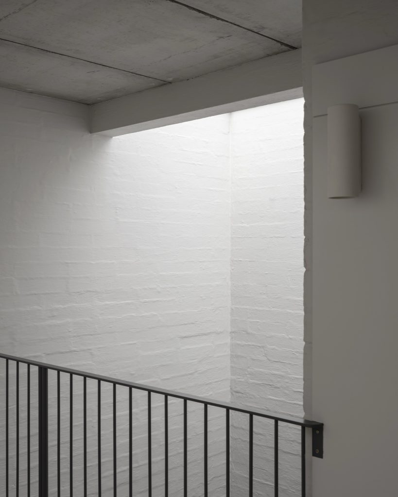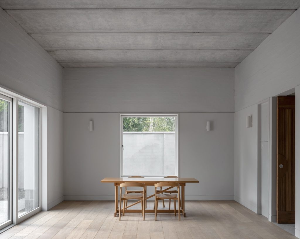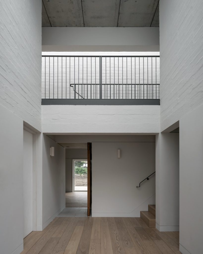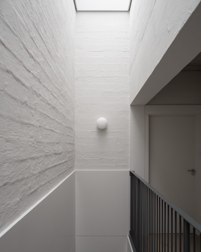 Material expression reinforces that calm structure. A sharp plaster band runs through the lower level, establishing a clean register at human height. Above, rougher construction elements are left present, allowing texture to catch the light and make the building’s assembly legible. The contrast creates a subtle hierarchy: refined where the body meets the house, more direct and tactile where the structure asserts itself.