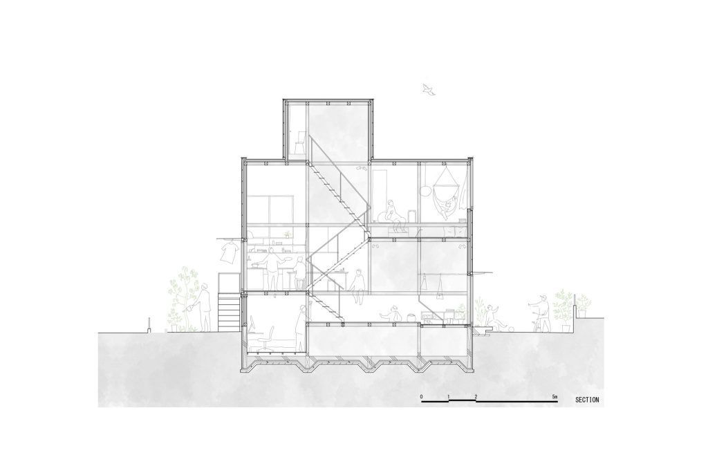 Through structural elisions, calibrated level shifts, and an intentionally permeable perimeter, the residence constructs a delicate balance. It supports six distinct lives with their own rhythms and boundaries, yet keeps the household legible as a shared whole. Like a collective in motion, the home remains perpetually reconfigurable, fostering independence without sacrificing the ease of being together.