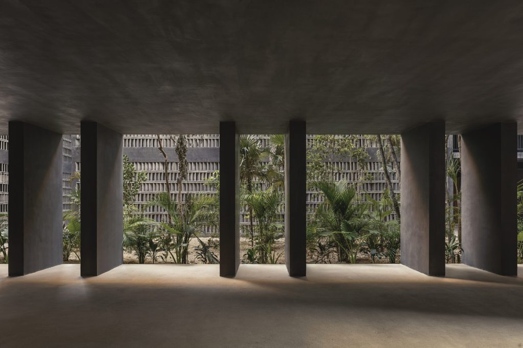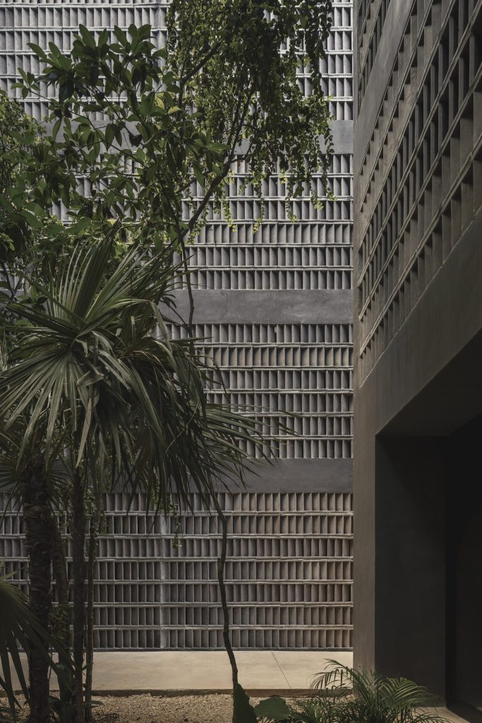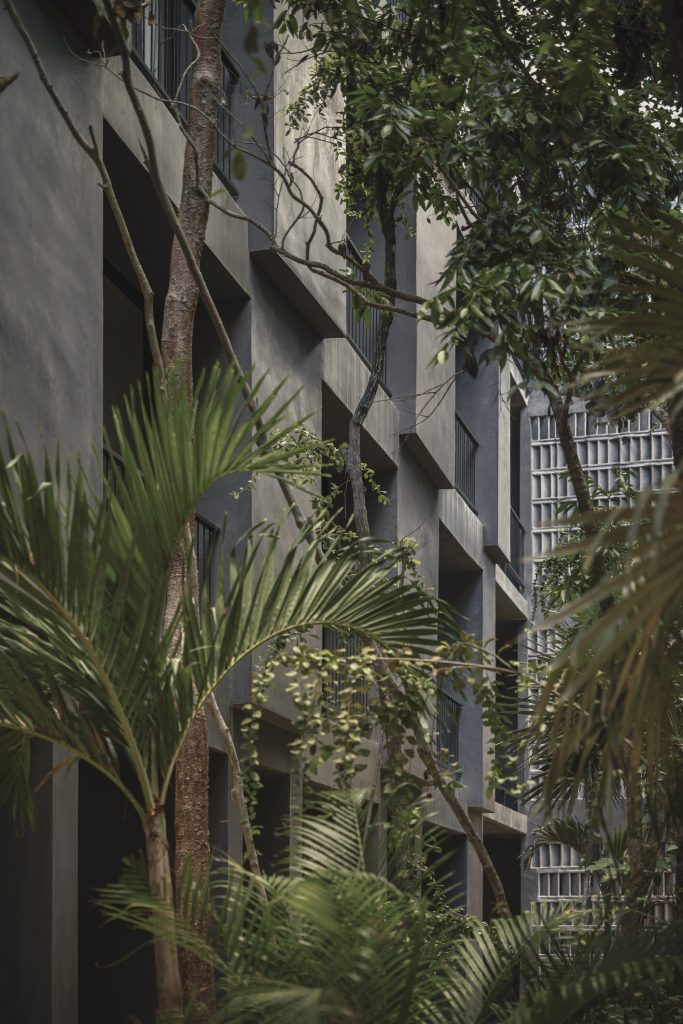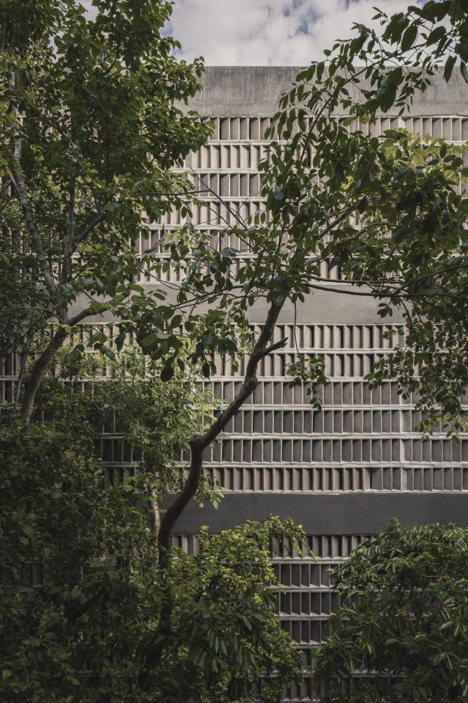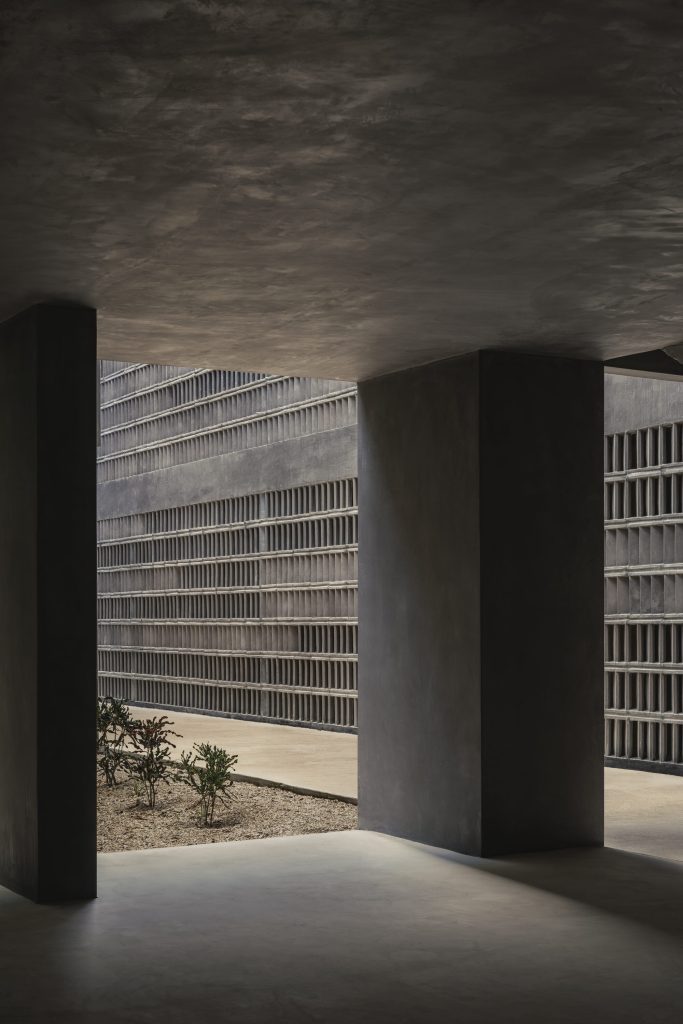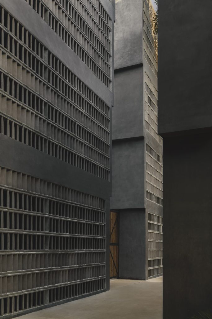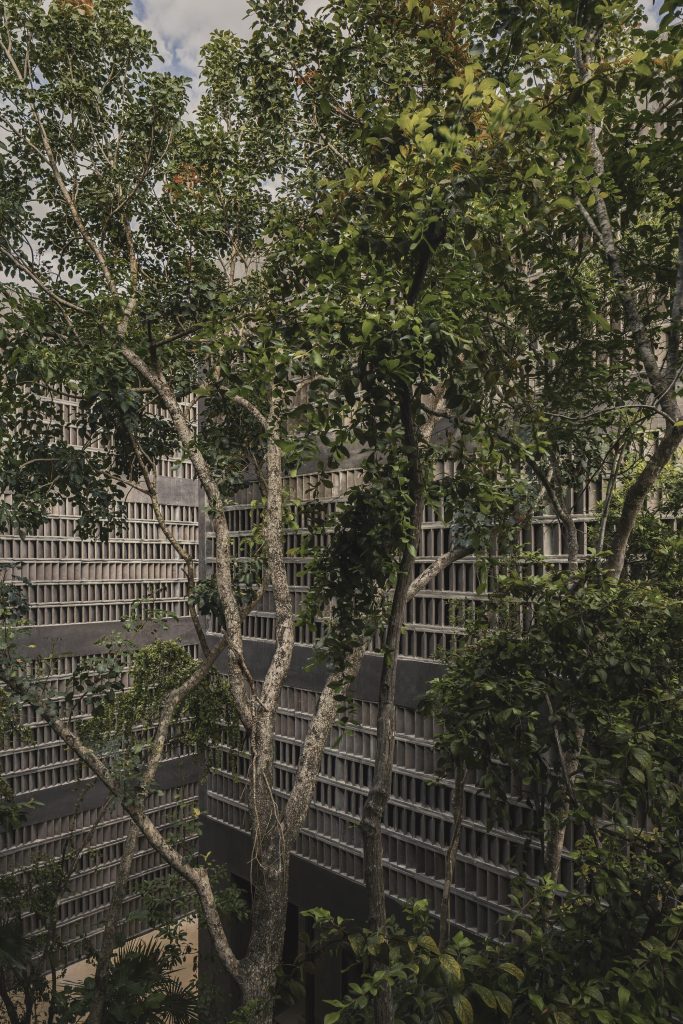The architecture is calibrated to respond to this filtered environment. Facades and circulation corridors are lined with porous screens, recalling the logic of brise soleil systems while adopting a finer, more tactile expression. These elements temper sunlight, enhance privacy, and contribute to passive environmental control.
