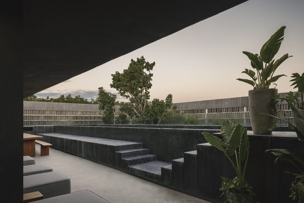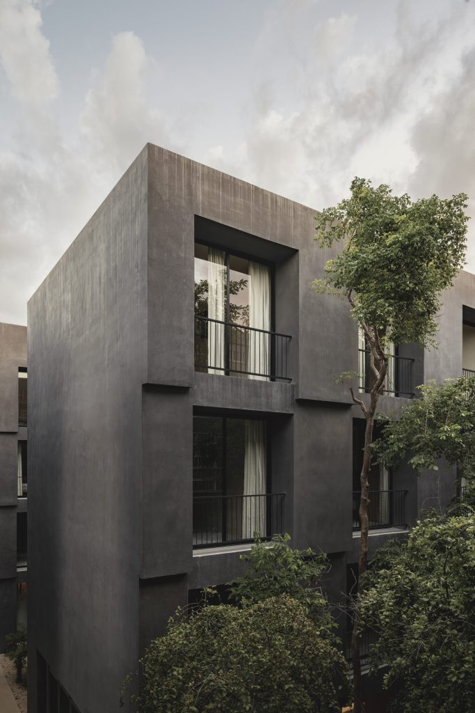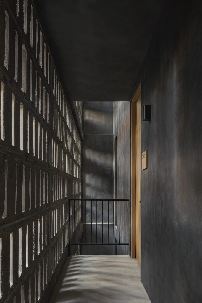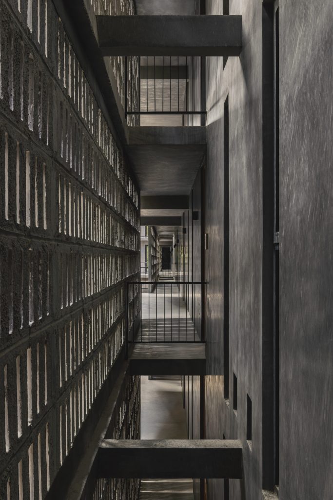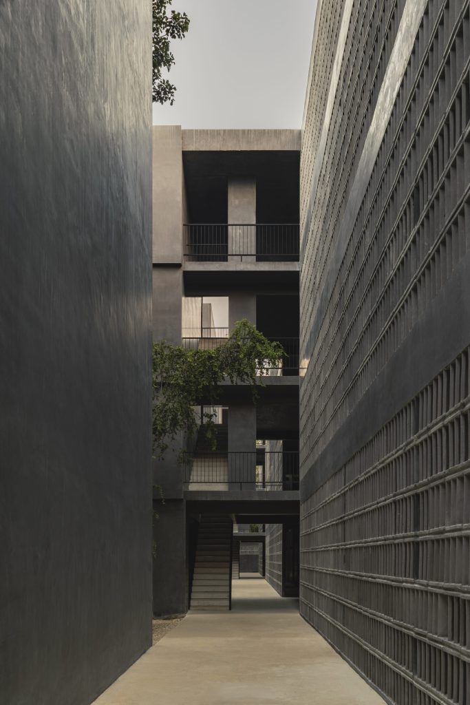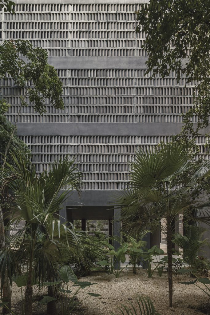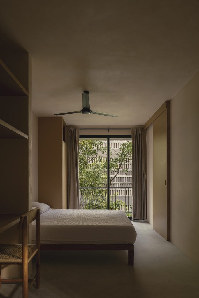 The architecture is calibrated to respond to this filtered environment. Facades and circulation corridors are lined with porous screens, recalling the logic of brise soleil systems while adopting a finer, more tactile expression. These elements temper sunlight, enhance privacy, and contribute to passive environmental control.