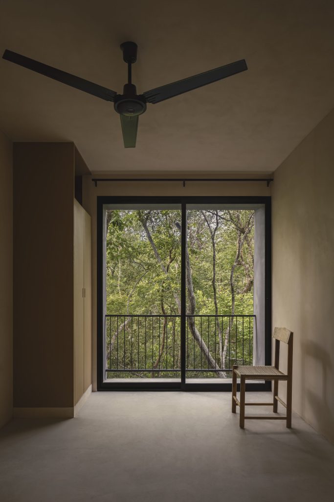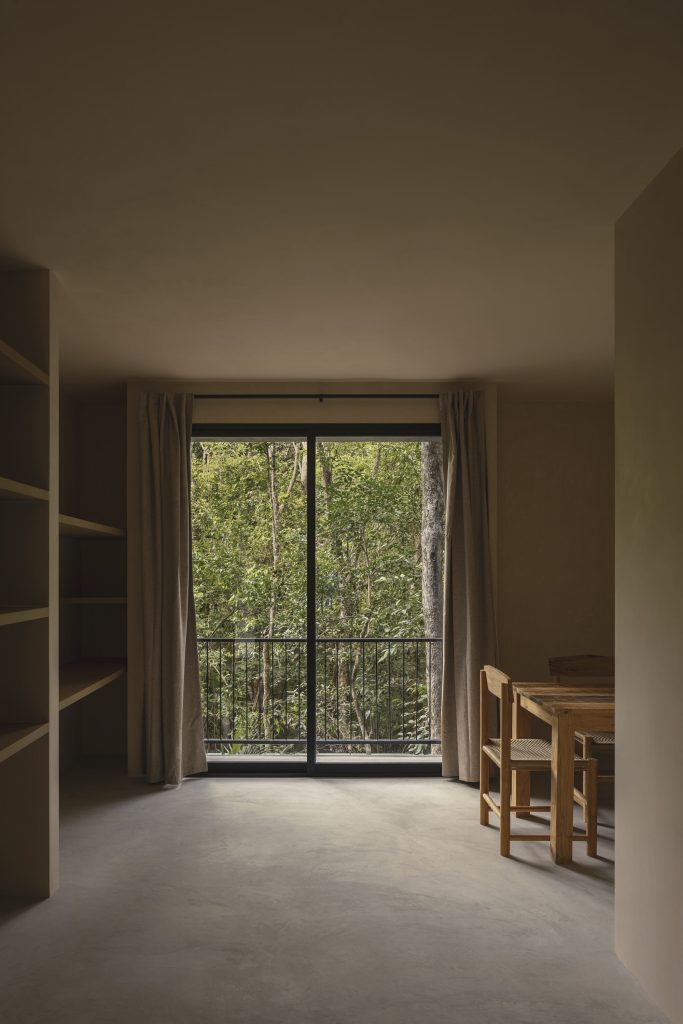 Internally, each apartment is conceived as a simple linear volume, a spatial tube that establishes a direct relationship between interior life and the surrounding vegetation. This clarity of plan allows for cross ventilation and a continuous visual connection to the landscape, reinforcing a sense of openness despite the project’s density.