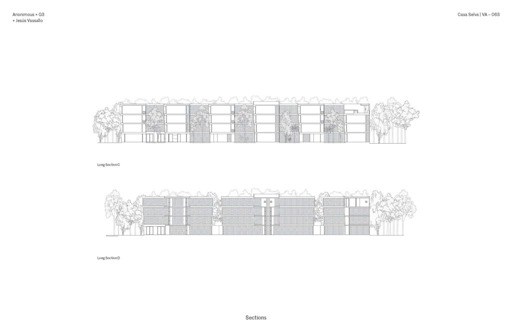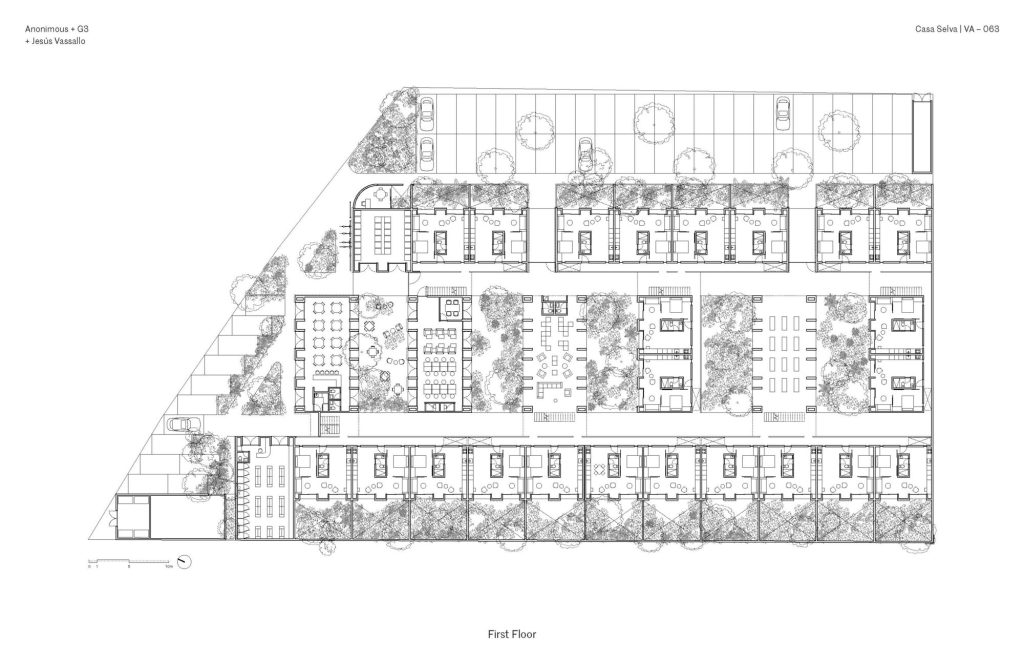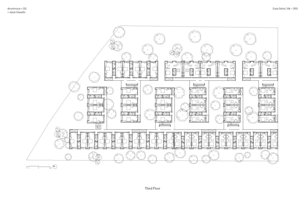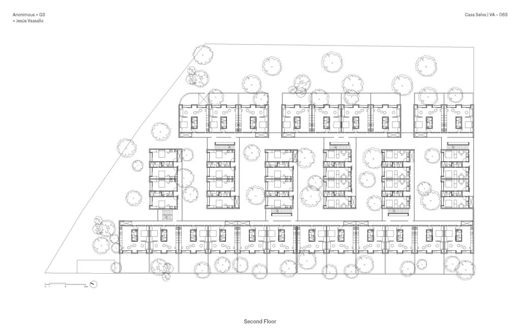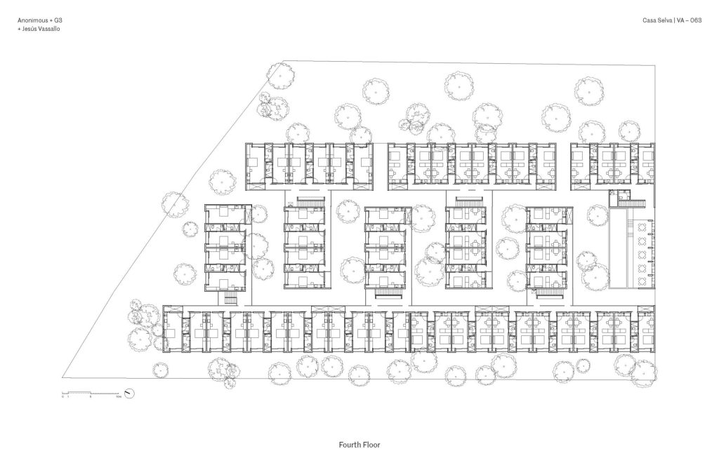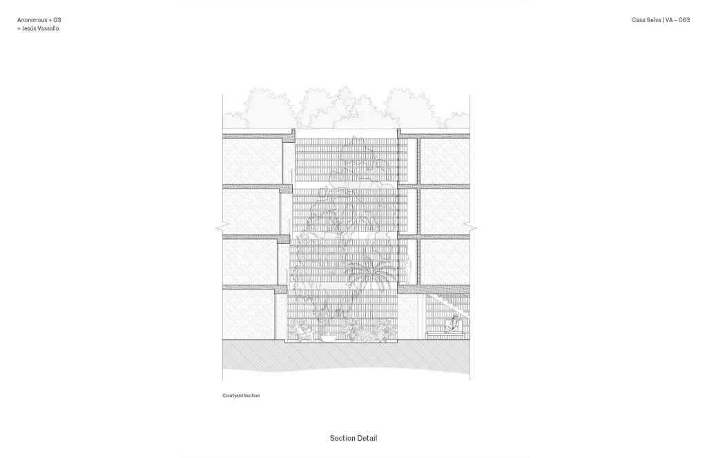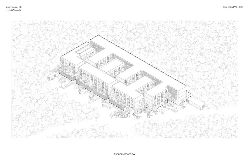 Set on a densely vegetated site, the project organizes a series of four storey blocks into an interlocking comb-like configuration. Between them, a continuous network of courtyards structures both circulation and social life. These open spaces preserve the existing tropical vegetation, including native palms and deciduous trees, which act as natural buffers between units while softening the relationship between architecture and road.