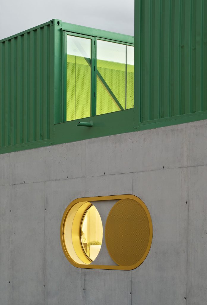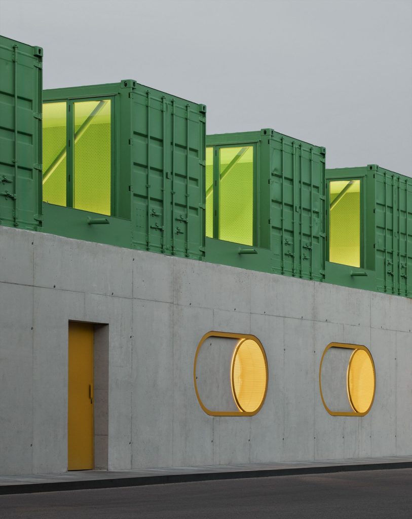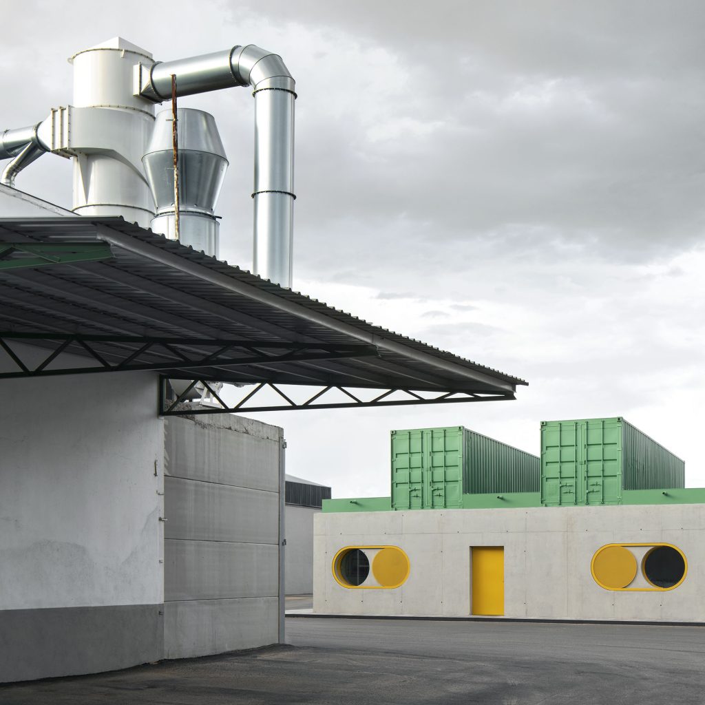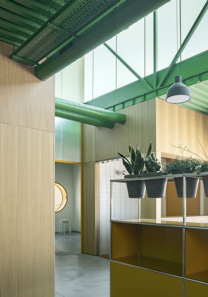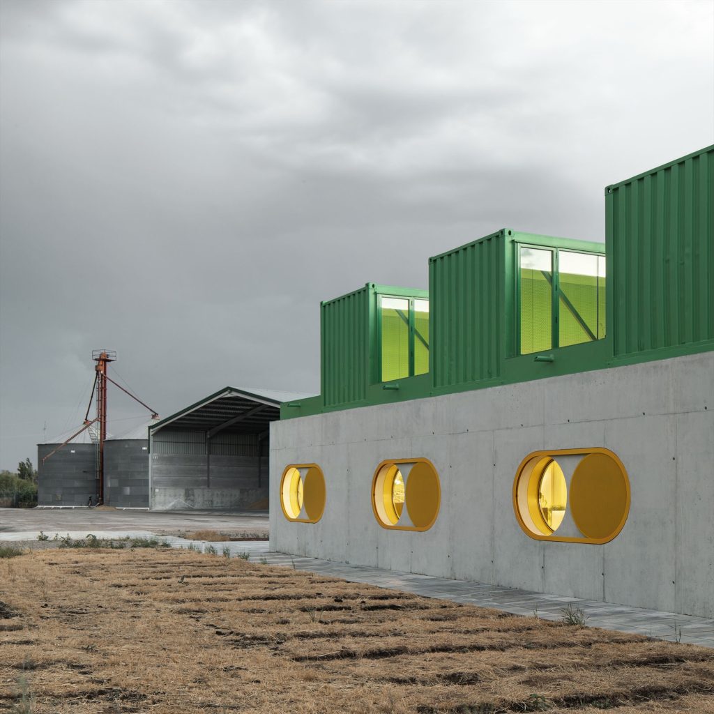 This duality is expressed with disarming directness. The corporate colours, green and yellow, are applied unapologetically across the façades. Large circular openings puncture the envelope, each protected by manually operated round shutters that evoke the graphic clarity of a digital switch. The gesture is both pragmatic and symbolic, signalling a shift from purely agricultural production toward research-driven innovation.