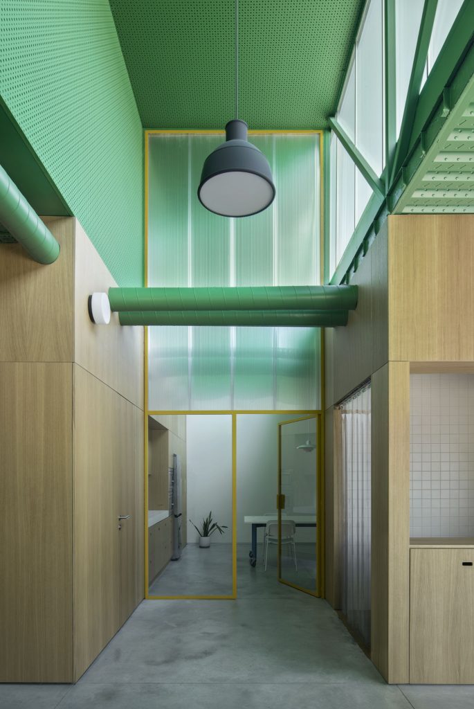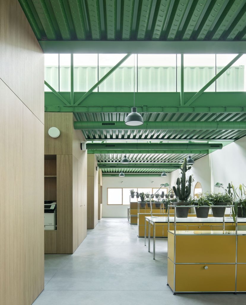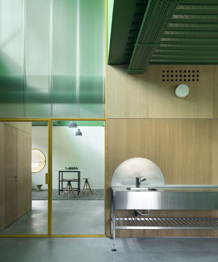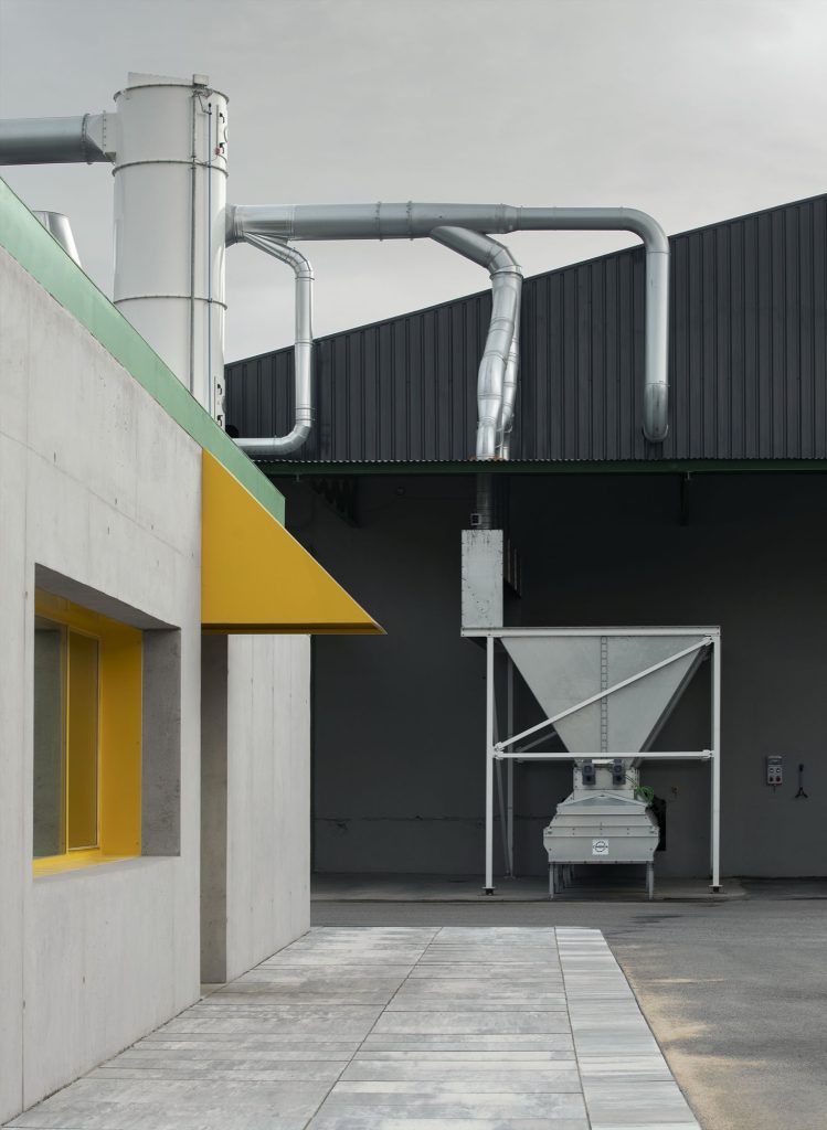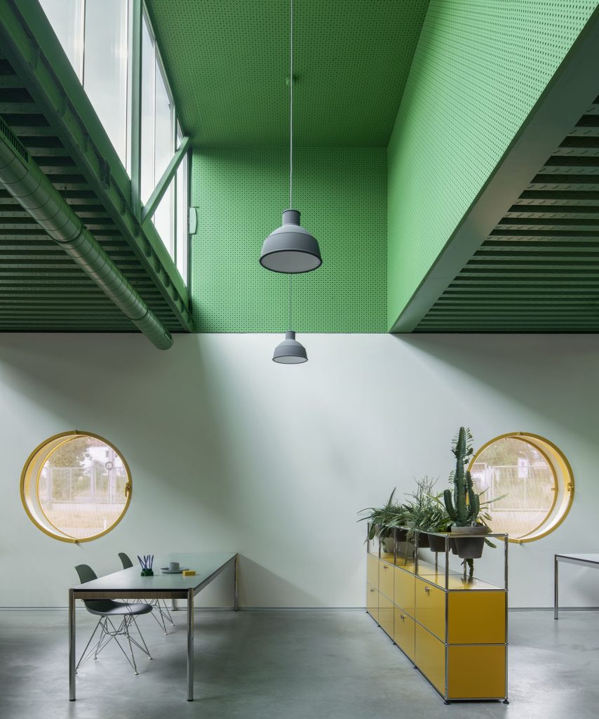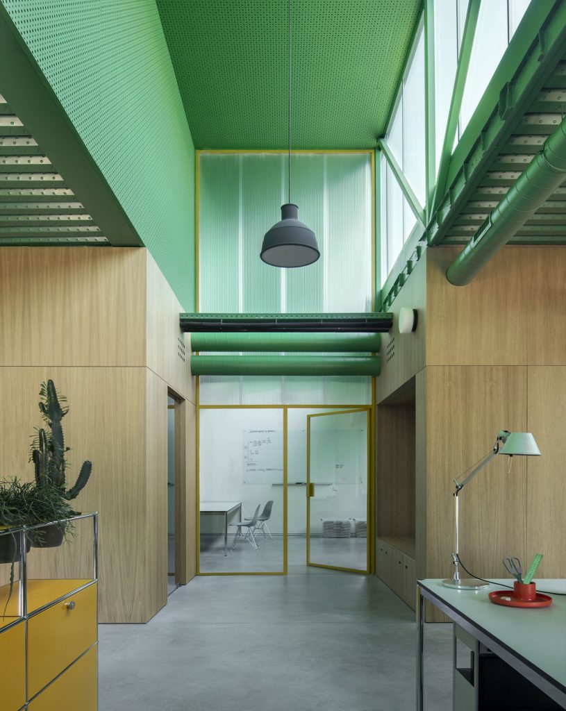 This duality is expressed with disarming directness. The corporate colours, green and yellow, are applied unapologetically across the façades. Large circular openings puncture the envelope, each protected by manually operated round shutters that evoke the graphic clarity of a digital switch. The gesture is both pragmatic and symbolic, signalling a shift from purely agricultural production toward research-driven innovation.
