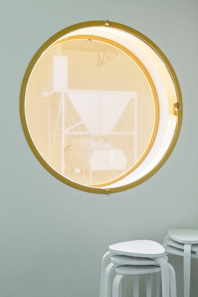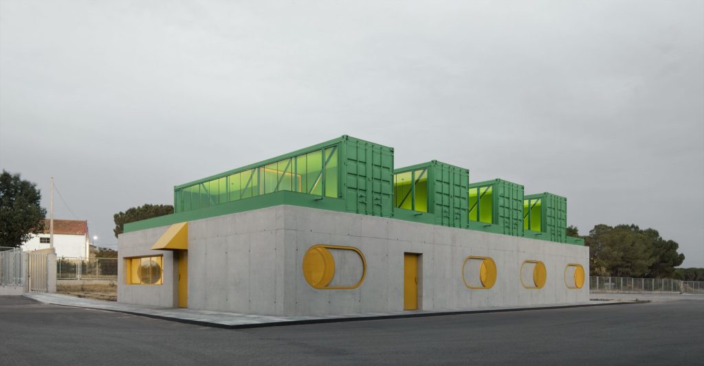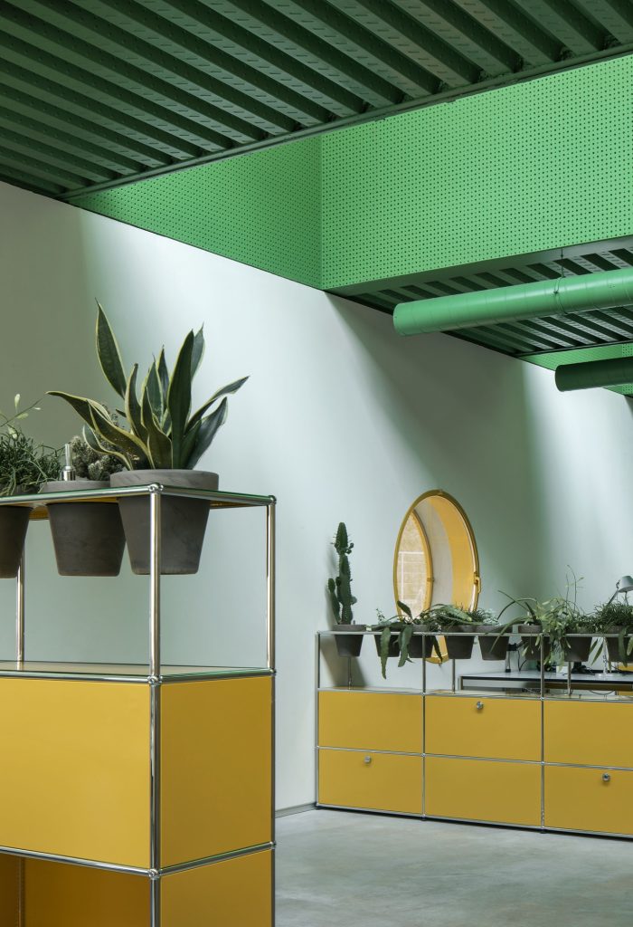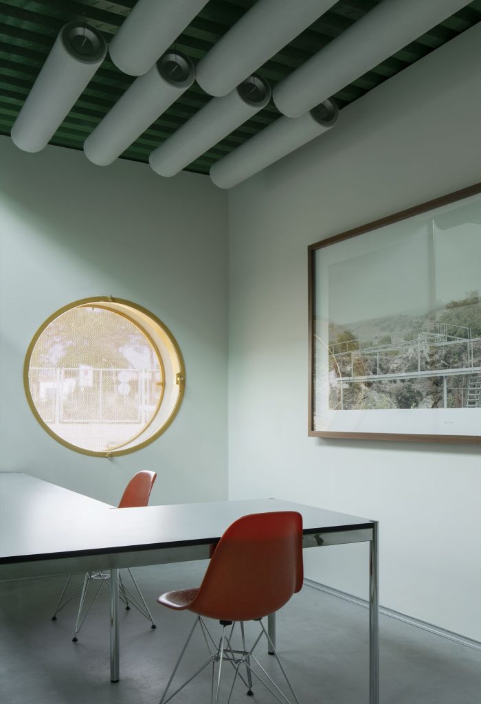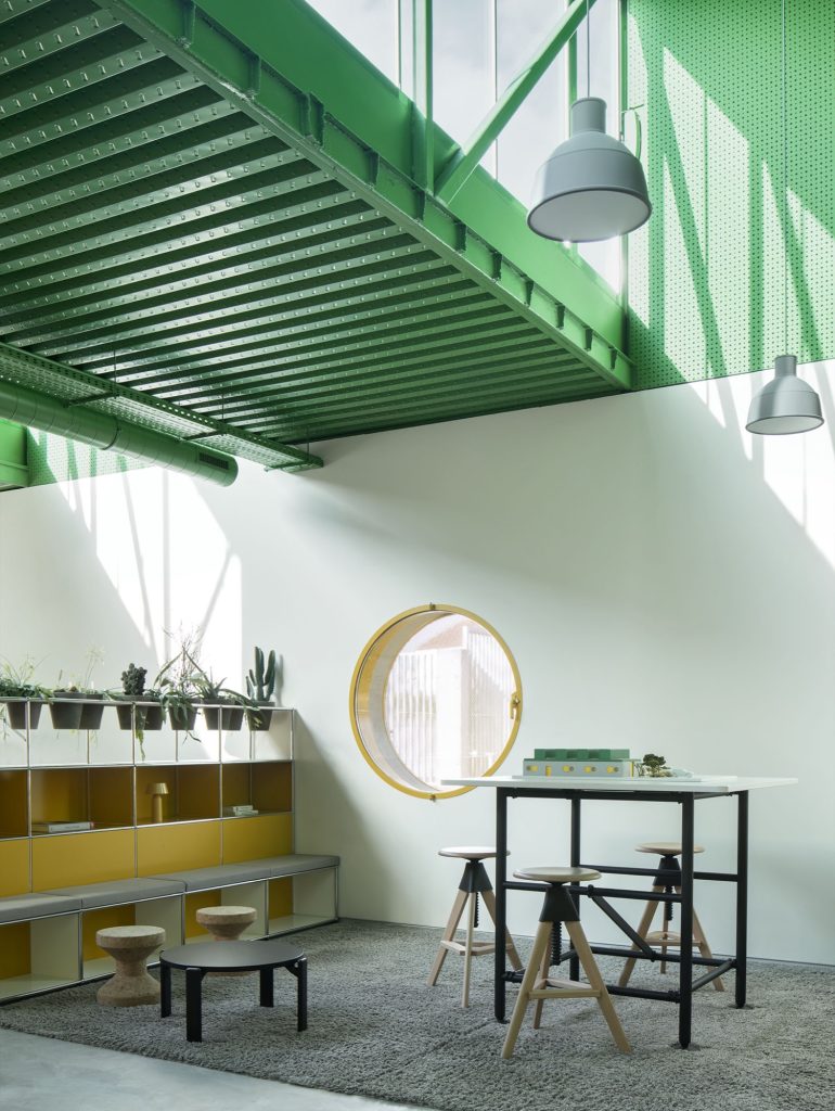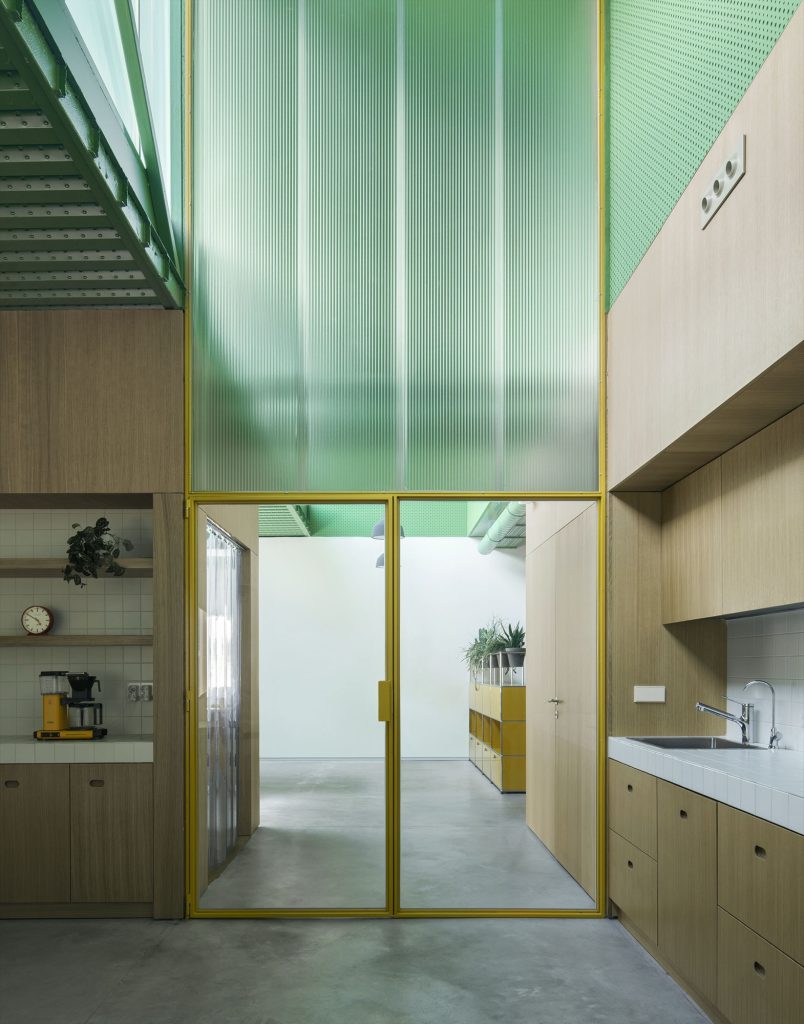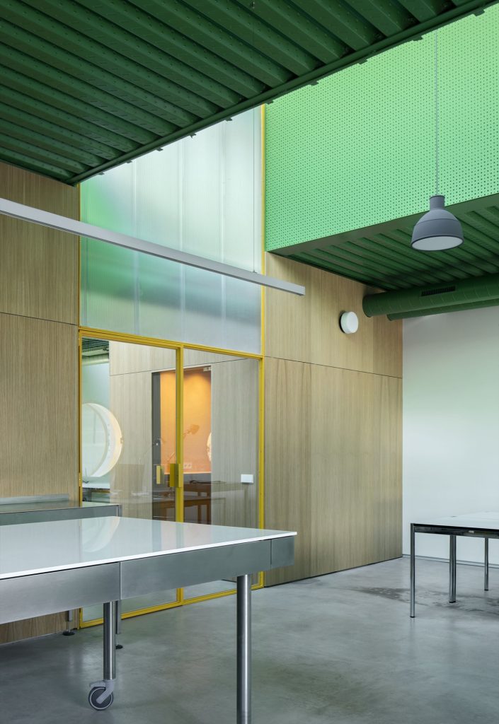 This duality is expressed with disarming directness. The corporate colours, green and yellow, are applied unapologetically across the façades. Large circular openings puncture the envelope, each protected by manually operated round shutters that evoke the graphic clarity of a digital switch. The gesture is both pragmatic and symbolic, signalling a shift from purely agricultural production toward research-driven innovation.