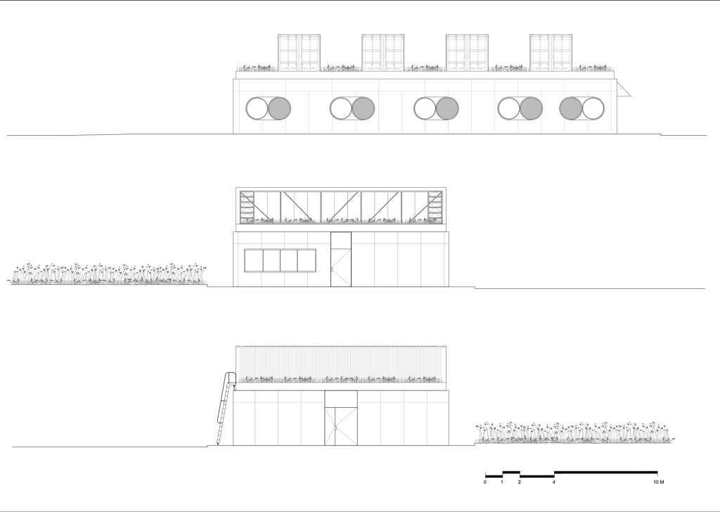 Four reused standard shipping containers, opened along two sides, form the core of the spatial strategy. Resting on a concrete plinth common to the sheds, their arrangement generates a saw-tooth roof profile that operates as a continuous sequence of skylights. Oriented to the north, these planes provide controlled, even daylight and lend the interior an unexpected spatial richness. The reuse of industrial elements reinforces the project’s ethos of pragmatic sustainability.