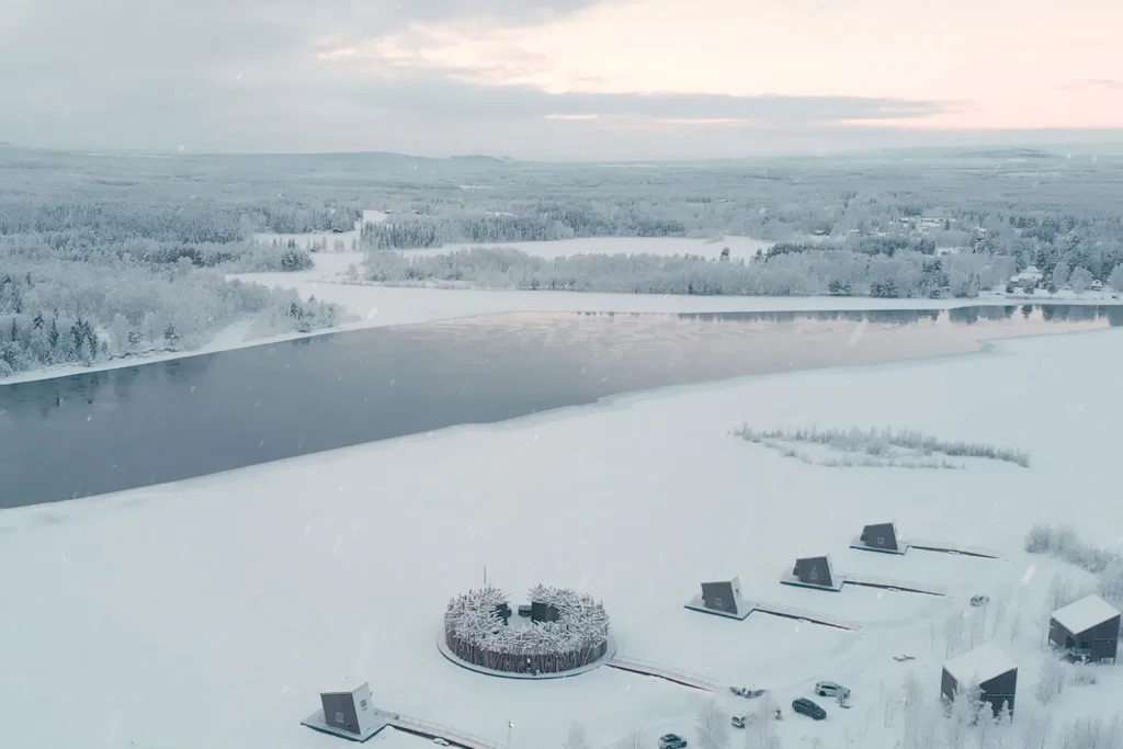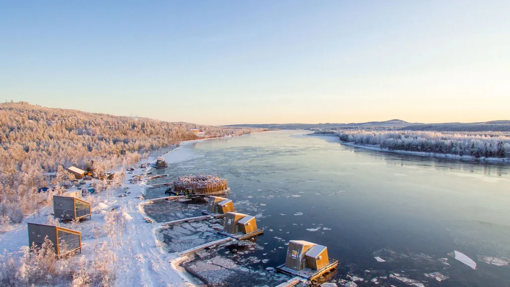 Arriving in Harads, a small village in Swedish Lapland, the landscape already begins to slow you down. The road narrows, the forest thickens, and the Lule River stretches out in long, quiet curves. Then, almost unexpectedly, Arctic Bath appears – resting on the river like a circular apparition, somewhere between a log jam and a contemporary sanctuary.