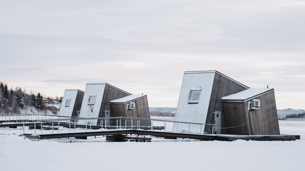 The first impression is not of a hotel, but of a structure that belongs to the place. Floating gently in summer and locked into ice through the winter months, the building responds to the Arctic seasons rather than resisting them. Its ring-shaped form references the timber-floating era once central to life along the Lule River, when logs gathered naturally into dense clusters on the water. The concept was developed by architects Bertil Harström and Johan Kauppi, also known for the nearby Treehotel. Here, their architectural language feels quieter, more elemental – less about spectacle, more about immersion.