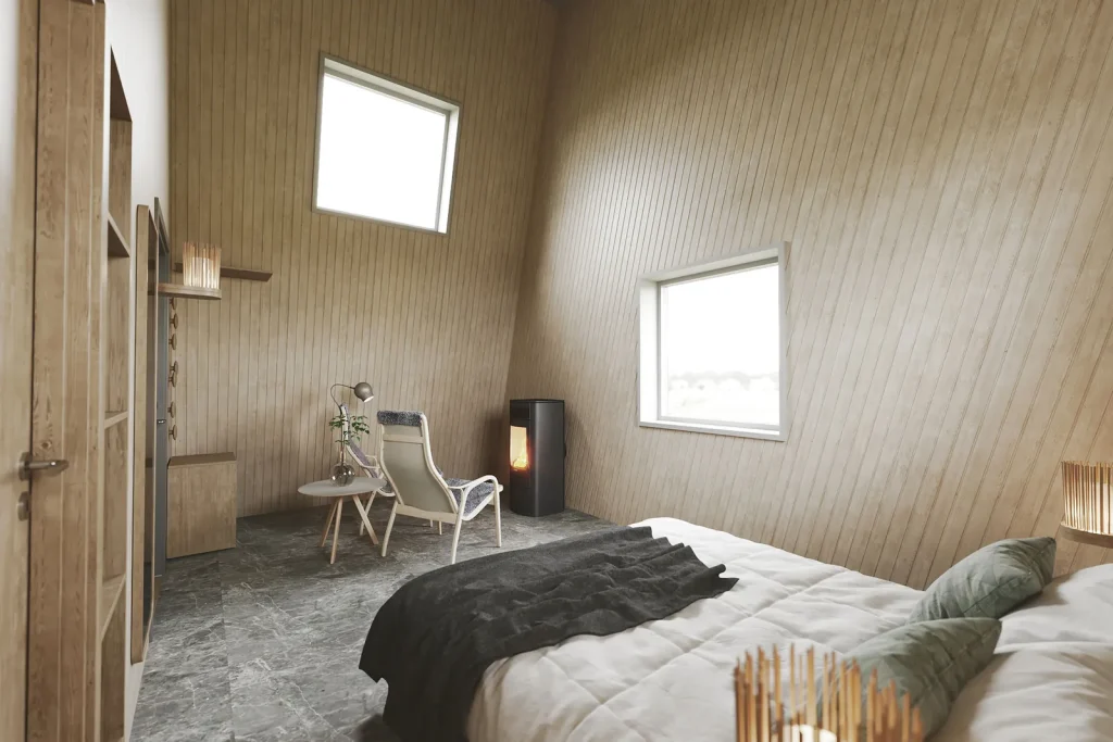 The floating cabins extend this relationship with water. Their angled silhouettes rise sharply from the river, each with a private deck that faces the vast northern sky. From here, nights stretch long and dark in winter, often lit by the aurora, while summer brings endless daylight and a river that never quite sleeps. The gentle movement of the water beneath the cabin is subtle, almost imperceptible, but it reinforces the sense of being temporarily untethered from land.