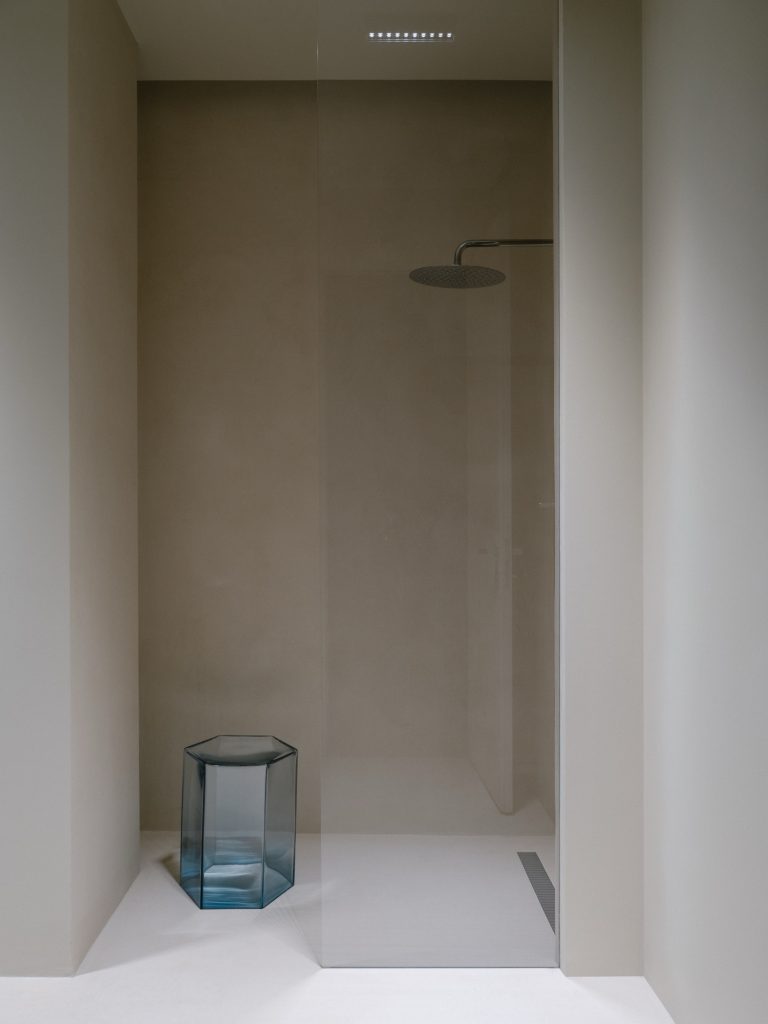 The color changed significantly depending on the lighting conditions, which was expected. However, I sought to identify the best solution that would appear harmonious at any time of day. My aim was to create a continuous transition from the vertical surface to the horizontal plane, producing an effect akin to the sense of infinity generated by reflections in mirrors.
