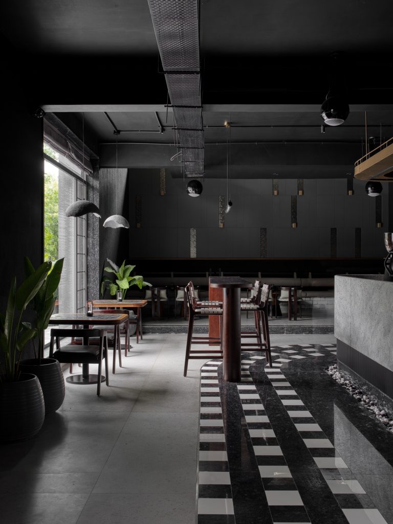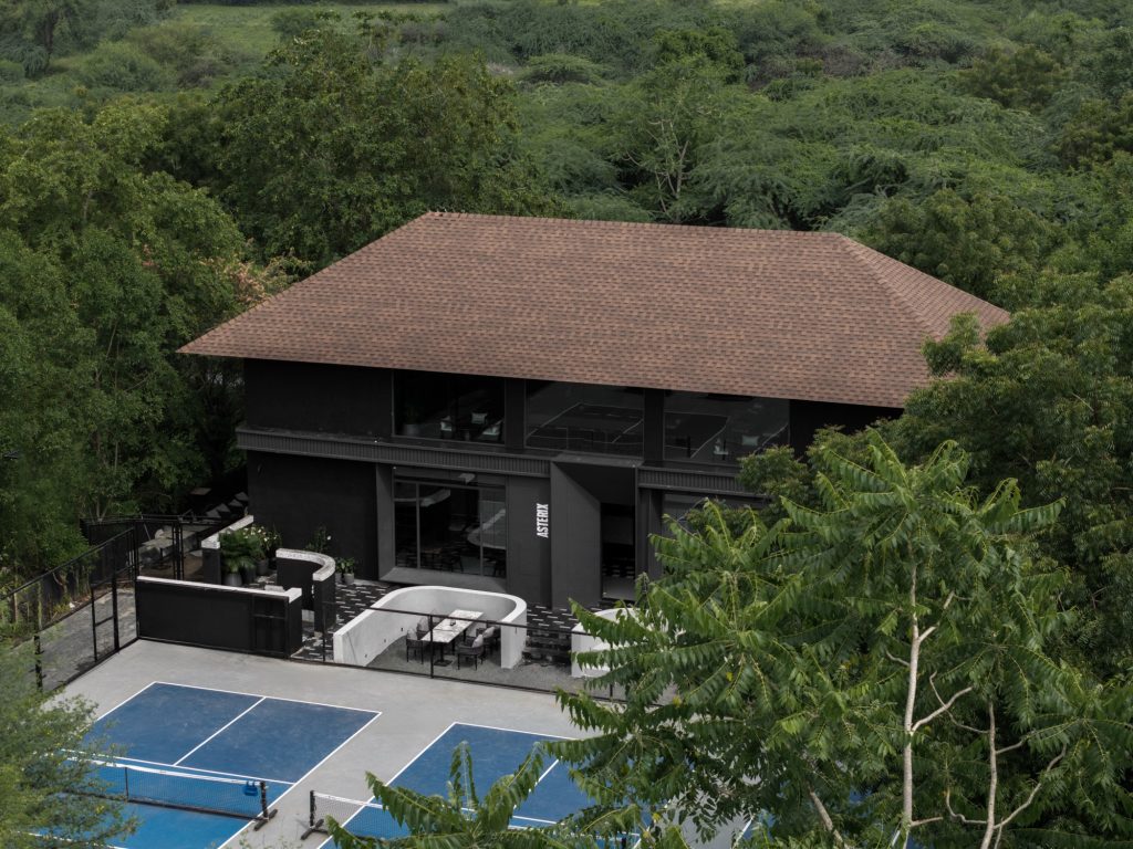 From the exterior, Asterix Café presents itself as a distinct black volume. The façade is clad in aluminum panels, paired with Kadapa stone flooring and a sloping brown roofline that softens the building’s silhouette. Together these elements establish a strong visual identity that allows the café to stand out within its urban context.
