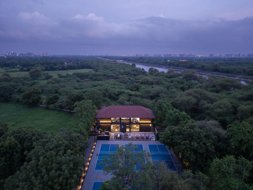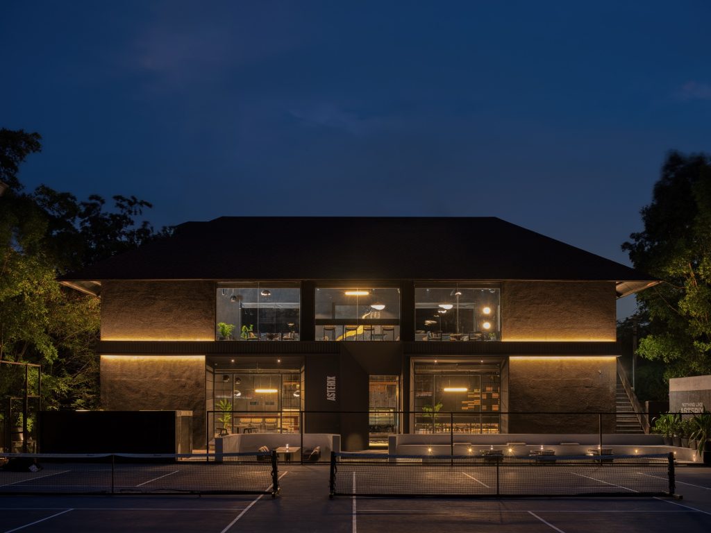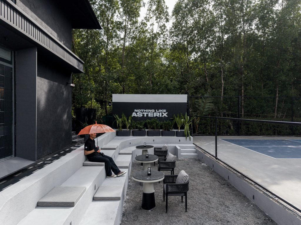 The project extends beyond the interior to create an active social threshold. An outdoor amphitheatre links the café with adjacent pickleball courts, allowing visitors to engage with both sport and social life while occupying the same spatial field. The gesture transforms the café into a place of gathering rather than a purely commercial venue.
