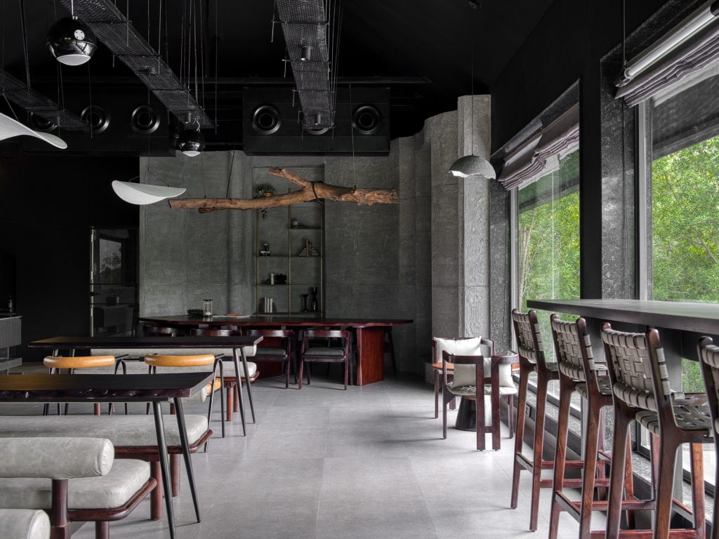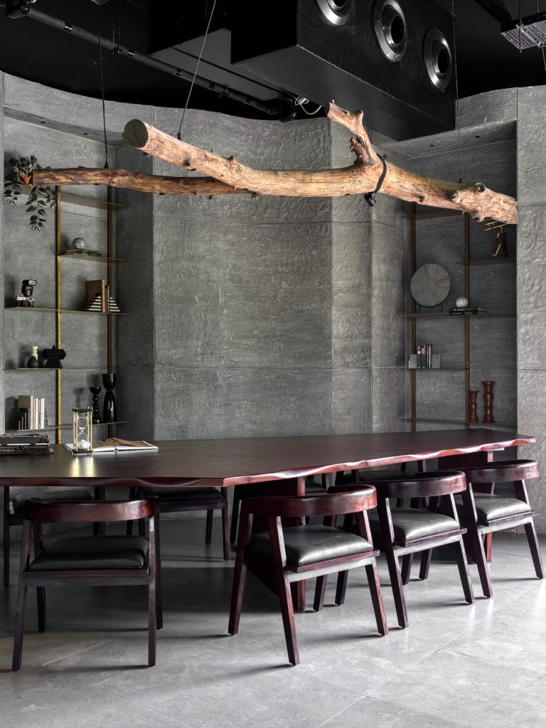 This approach becomes most evident in the first floor “cave corner,” where a communal table carved from live edge timber sits beneath pendant lights fashioned from tree logs. The space evokes a gathering point that feels simultaneously raw and refined, suggesting an architectural interpretation of shelter rooted in nature.