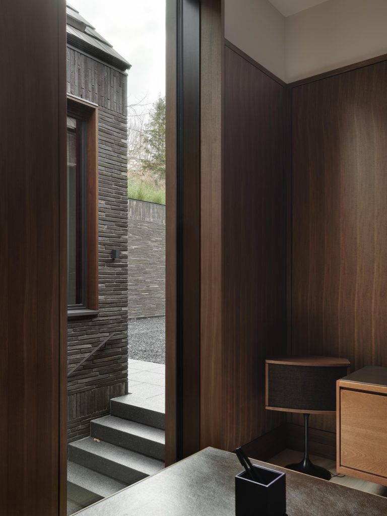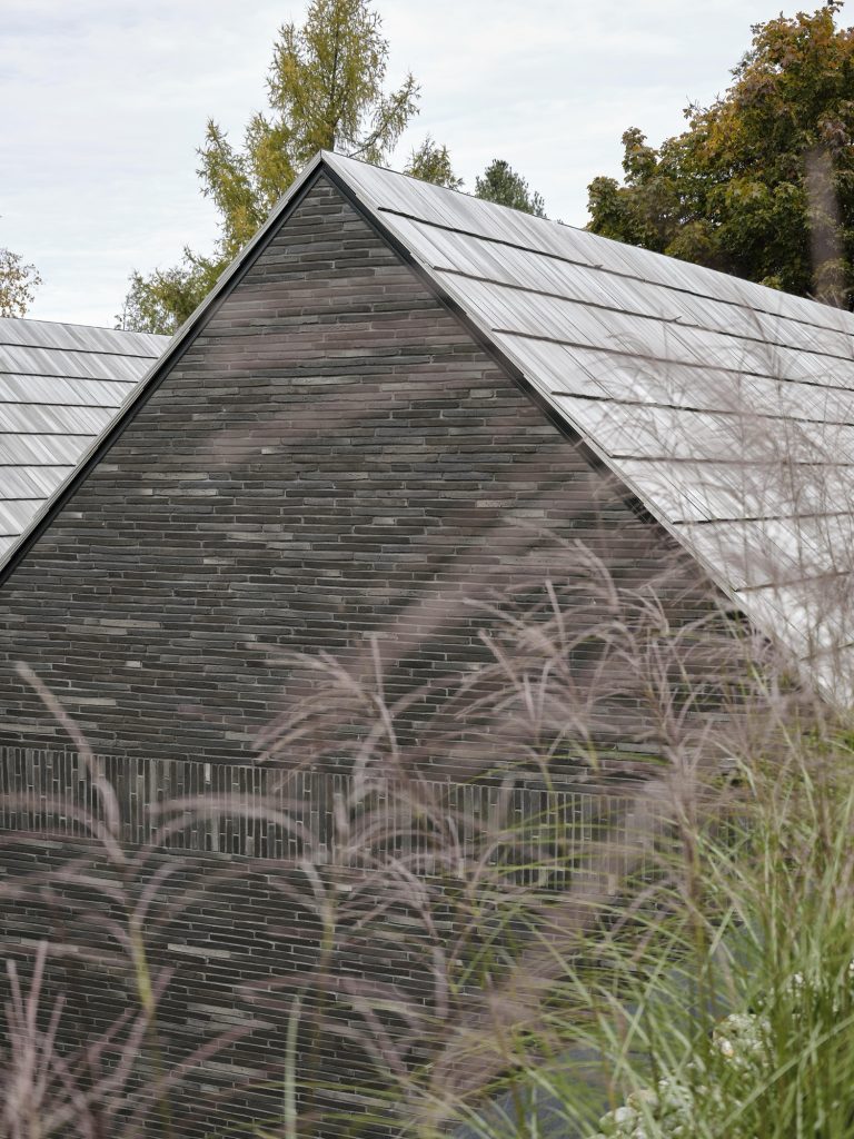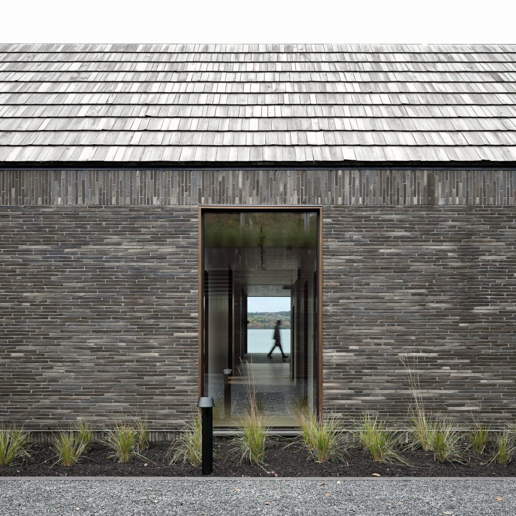 Atelier Échelle selected materials with an eye toward erosion and patina. The exterior is clad in dark, water struck clay brick sourced from Denmark, whose irregular texture deepens under shifting light. Oversized roof shingles were custom fabricated locally, amplifying the barn reference while asserting contemporary precision.