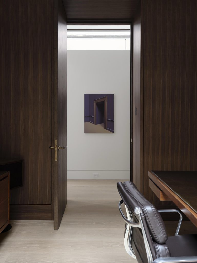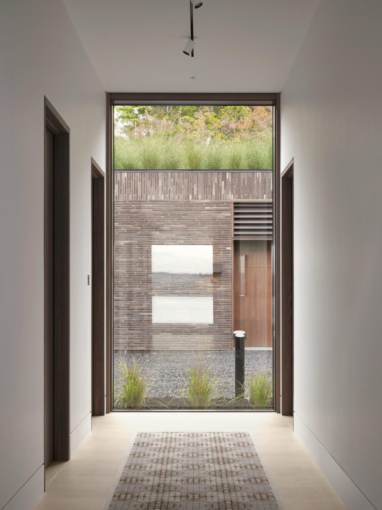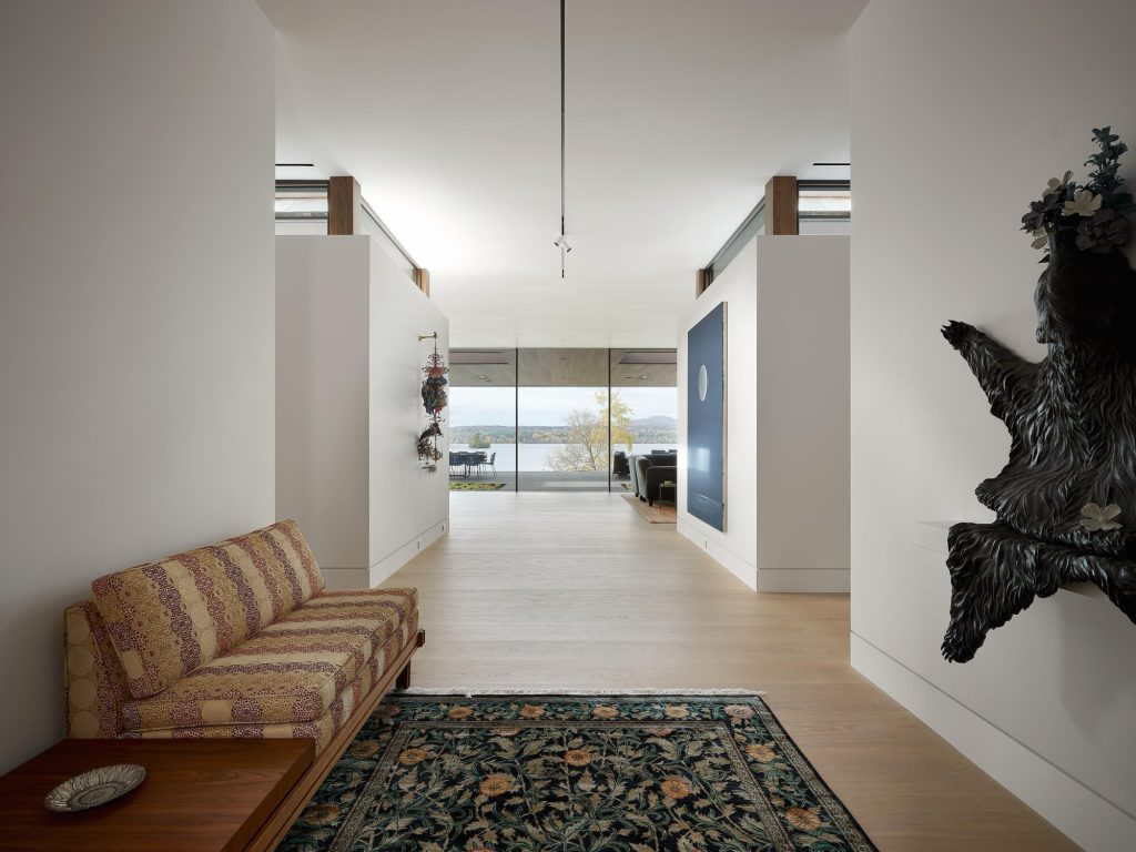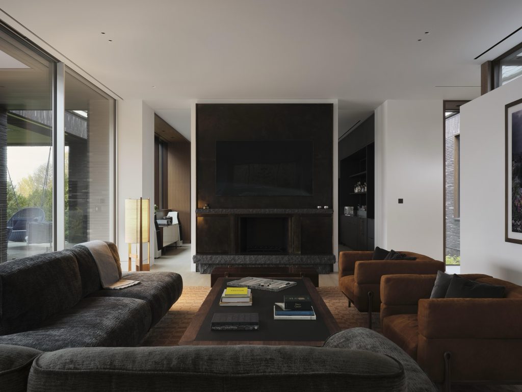 Constructed from reinforced concrete, steel framing and brick infill, the residence balances mass with transparency. A bespoke structural system allows motorized glass panels spanning more than 50 feet to retract, dissolving the threshold between interior and exterior. The 11 foot tall wood entry door opens into a gallery space aligned precisely with the lake beyond, transforming arrival into a choreographed visual axis.