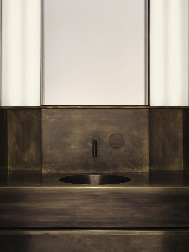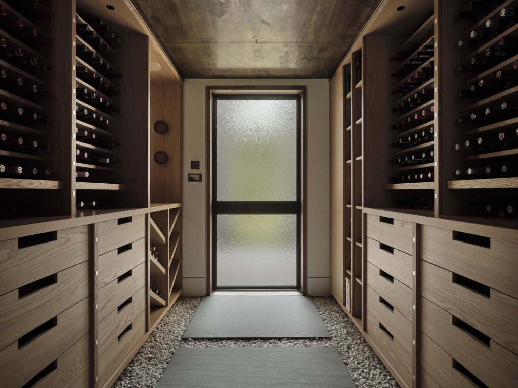The wine cellar holds more than 1,200 bottles, organized around the distinctive silhouette of the Bourgogne bottle. A micro fluted glass and bronze door opens into a chamber clad in compressed white oak millwork, suspended between gravel flooring and a reflective bronze ceiling. Recessed lighting and mirrored surfaces produce a warm glow that amplifies depth and reflection.