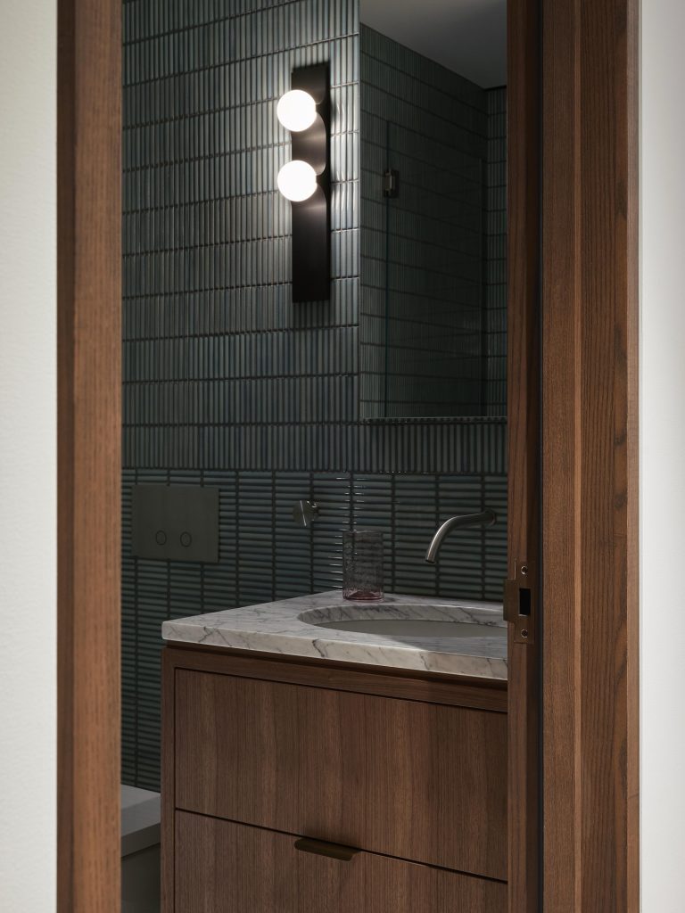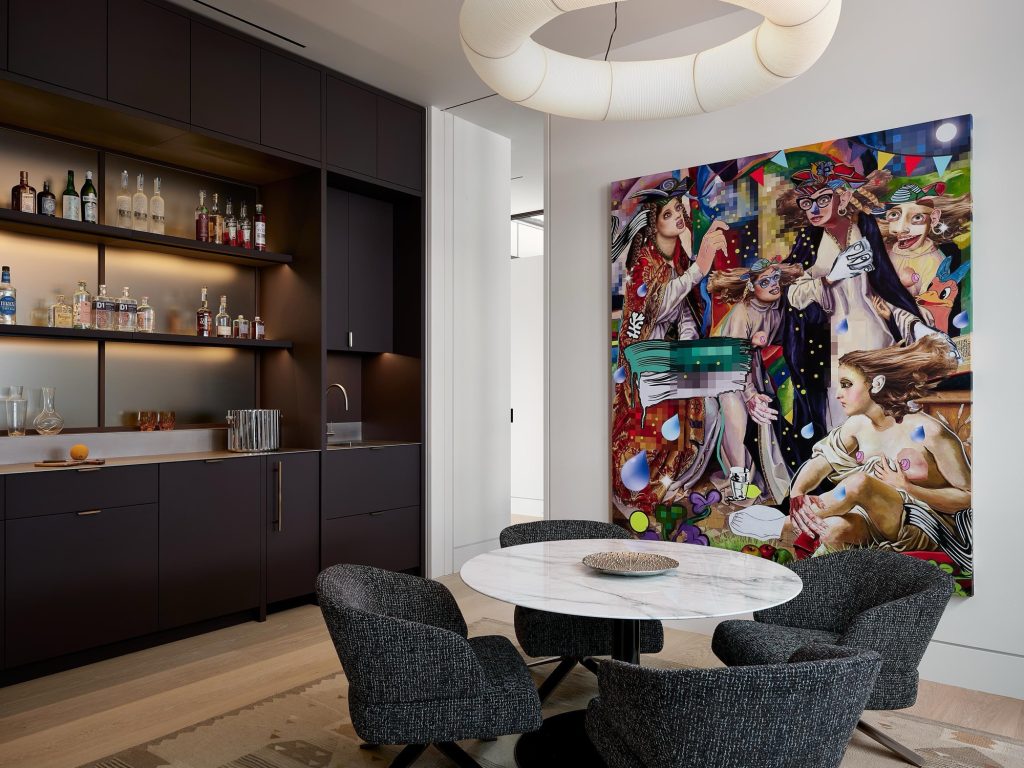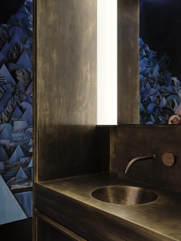 Art is embedded into the architecture rather than appended to it. In the powder room, a mural by Simon Hughes encircles the walls, depicting the four seasons. To preserve uninterrupted surface, a bronze vanity stands as a freestanding column at the room’s center. At the pool, Hughes translates the motif into tilework suggestive of floating icebergs, a poetic counterpoint to heated water.