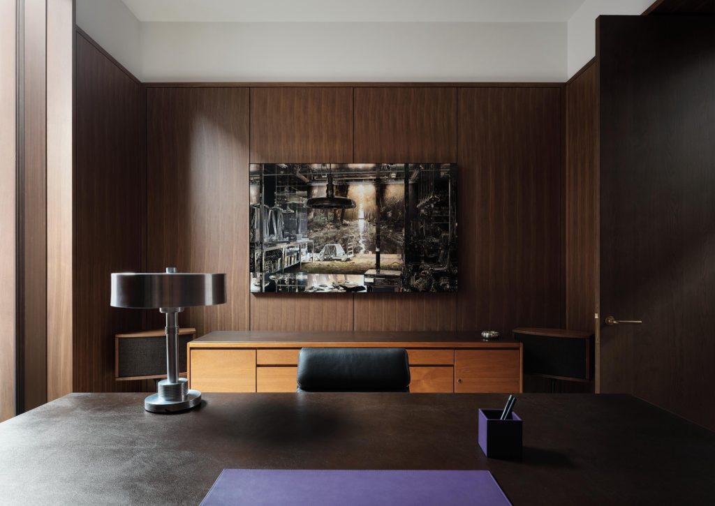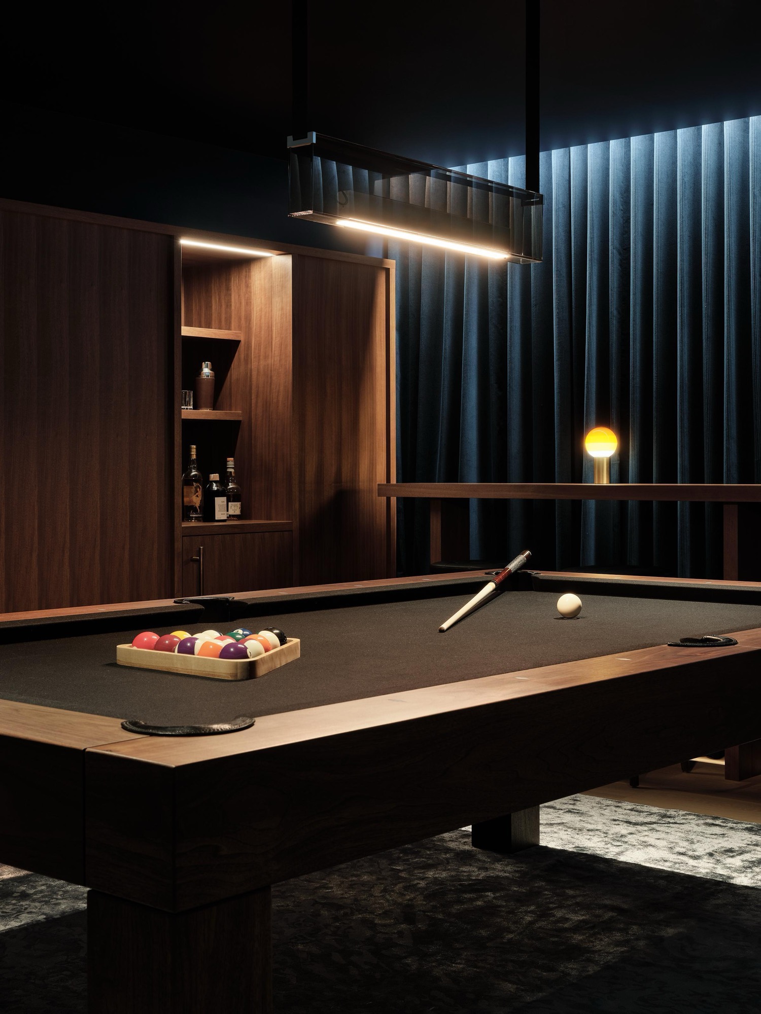 Elsewhere, the billiards room introduces a more intimate register. Deep blue corduroy drapery and walnut millwork envelop the space, while black felt surfaces echo in the suspended light fixtures above, creating a subdued and tactile environment.