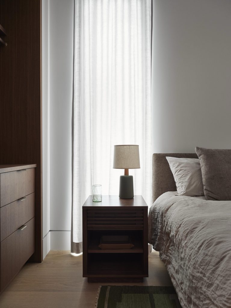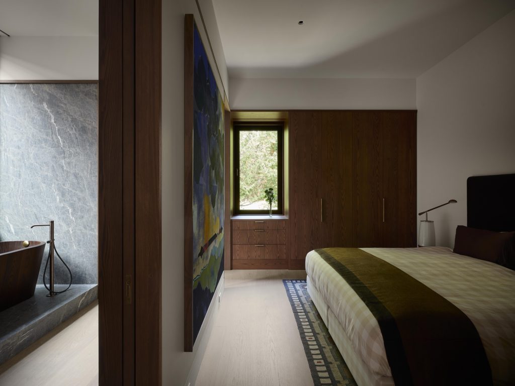 The living quarter contains the primary suite, office, wine cellar, pantry and powder room. The guest quarter, positioned furthest from the lake, accommodates five bedrooms and a children’s lounge. Glass bridges connect each structure, hovering lightly above the terrain and reinforcing the perception of separate pavilions in dialogue with one another.