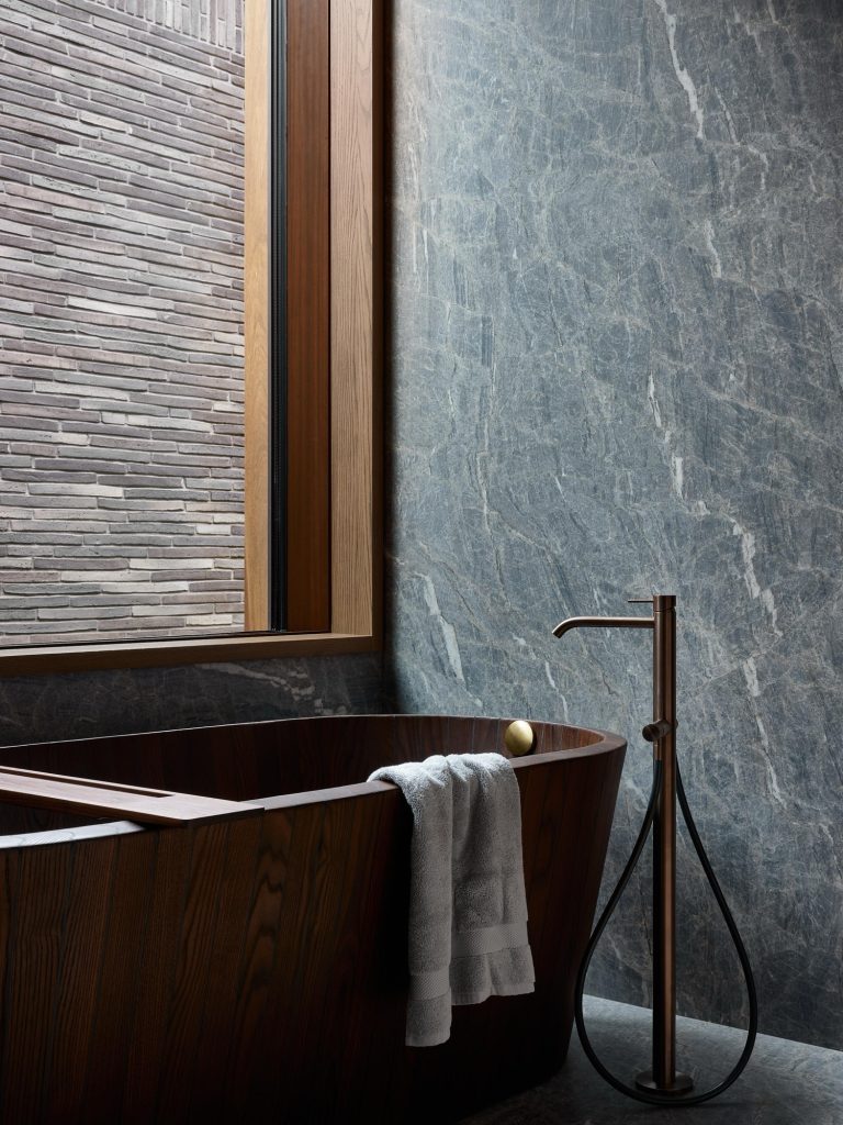 Stonework across terrace, garden, exterior kitchen and fireplace employs locally sourced Cambrian granite in tones of black and gray. Inside, the kitchen island is carved from a single block of rough stone, topped with a charred live edge walnut slab that rises to bar height. The palette privileges tactility and weight, inviting time to leave visible traces.