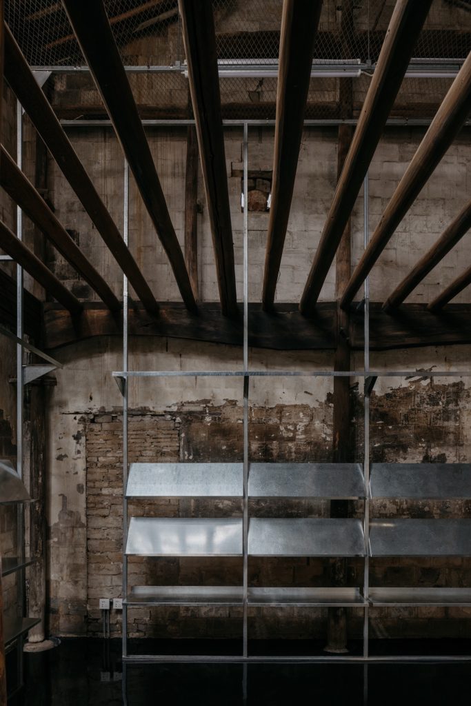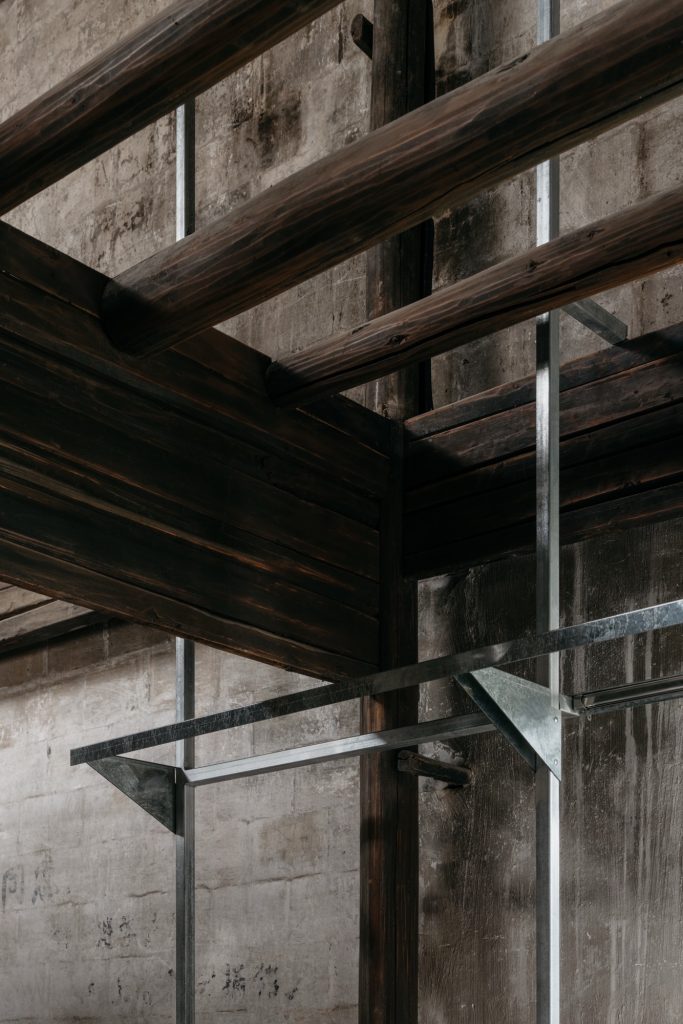Inside the historic house, later infill elements were removed to expose the original timber structure. A lightweight galvanized steel framework is inserted through the existing rafters without altering them, supporting seating, display surfaces, and lighting. The floor is finished with black epoxy resin, clearly distinguishing the new insertions from the aged timber surfaces.