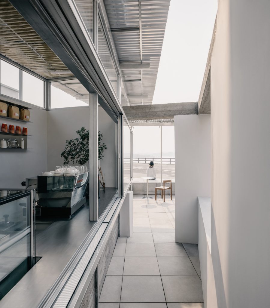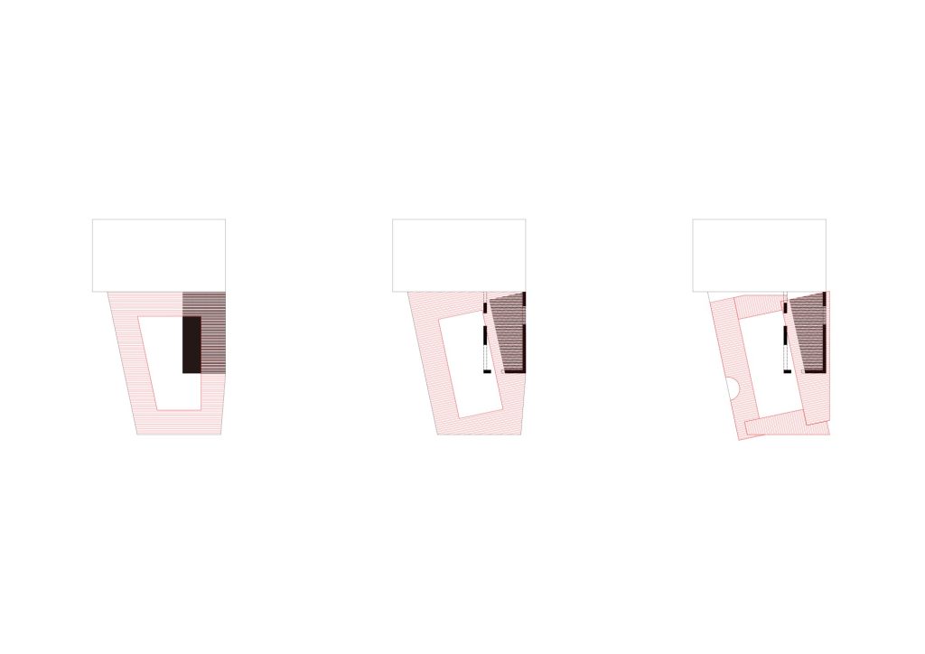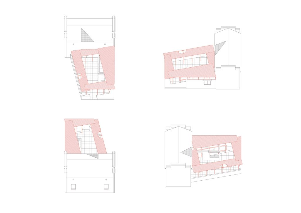 The roof of the passage varies in height in response to its surroundings. Along the village road, the passage cuts diagonally through the former kitchen annex, forming a café window. The roof then lowers to define the entrance before descending further along the neighbouring wall, where it accommodates an existing tree. As the passage turns toward the historic house, it maintains a narrow gap from the facade to preserve the original frontage.