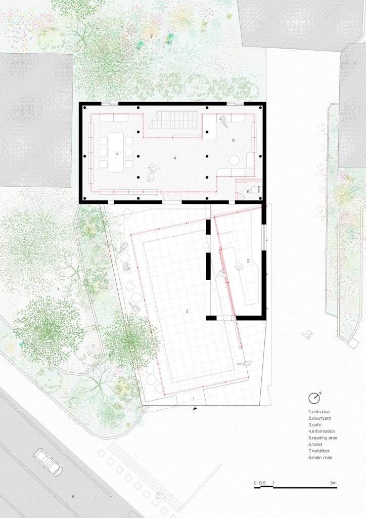 The intervention follows the irregular outline of the courtyard defined by the road, village paths, and a shared boundary wall. A single column passage wraps around the perimeter and establishes a rectangular courtyard set parallel to the shared wall and slightly angled relative to the main house. This configuration clarifies the site boundary while forming a buffer that filters road noise and allows airflow from the river.