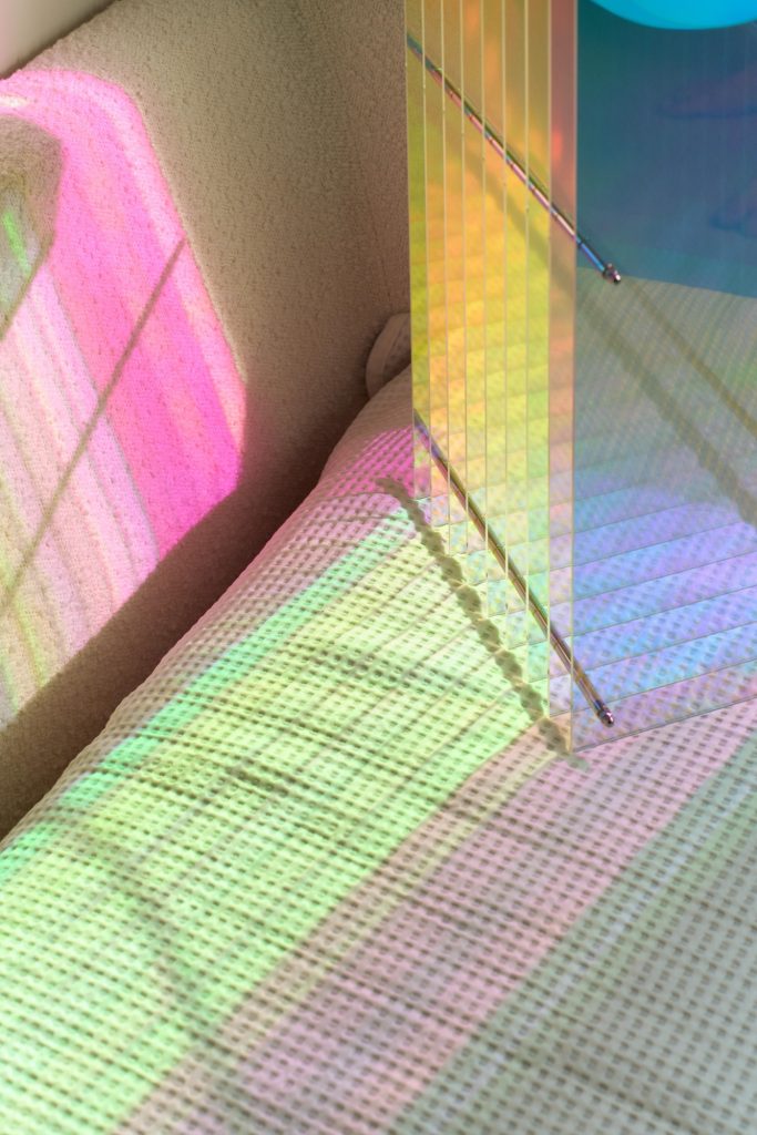 The Dreamy Lớp version intensifies this perception through iridescent acrylic. Light disperses across its surface, shifting in color and dissolving the boundaries of the object. In contrast, the stainless steel edition asserts weight and permanence. Its hand polished mirror surface transforms the same composition into a more architectural presence, where reflection becomes dense and controlled.